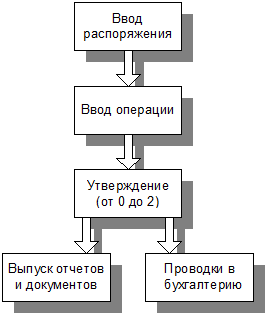 рисунок. 3.1.1. Пример последовательности выполнения операций. На каждом шаге выполняются следующие действия: Ввод распоряжений - регистрация в системе входящего документа или торгового приказа. Ввод операции - заполнение деталей операции: в интересах кого проводится, с какой ценной бумагой, на каком торговом рынке и т.д. Комиссии и сборы рассчитываются автоматически. Операции могут вводится по частям на нескольких рабочих местах. Например, часть данных вводится в торговом отделе, а часть в бэк-офисе. Утверждение - поэтапный процесс подготовки сделки. Первое утверждение делается после внесения всех данных, окончательное утверждение - после получения всех документов. В зависимости от настройки у сделки может быть от нуля до двух утверждений. Выпуск документов и отчетов - автоматический или полуавтоматический процесс выпуска необходимых документов: подтверждения о сделке клиенту и брокеру, сообщение в депозитарий и регистратору и т.д. Проводки в бухгалтерию - в конце дня формируется файл проводок для загрузки в бухгалтерскую систему. Для учета результатов операций с собственными ценными бумагами и бумагами клиентов используются лицевые счета ценных бумаг (или портфели ценных бумаг). В системе хранится информация о прошлом, настоящем, будущем, реальном и запланированном состоянии счетов, что позволяет автоматически контролировать допустимость операций. Например, система запрещает продавать бумаги, которых нет в портфеле (кроме разрешенных коротких позиций) или предупреждает, что продаваемые бумаги уже запланированы к продаже. В системе так же хранится информация о том в каких депозитариях хранятся собственные и клиентские бумаги. Пользователь сам может определять новые ценные бумаги, задавая их свойства. Данные по ценным бумагам, кроме свойств, включают в себя историю и прогноз цен, расписание выплат купонов и дивидендов. Эти данные могут браться из внешних информационных систем, таких, как REUTERS, DOW JONES TELERATE или PocБизнесКонсалтинг и представляют собой основу для проведения анализа прибылей-убытков и технического анализа. Система является мультивалютной, что позволяет учитывать сделки на разных торговых рынках, а затем оценивать портфели в одной валюте. Система гибко настраивается на существующую технологию работы: рабочие места, документы, отчеты и затем может быть перестроена "на ходу". Структура системы Signator/2000 Одна из идей, положенных в основу системы, заключается в том, что инвестиционная, регистраторская и депозитарная деятельность базируется в основном на одной и той же информации и состоит из аналогичных операций. Было выделено ядро системы, содержащее общую статическую информацию и процедуры и три прикладных модуля: торговых операций, регистраторских операций и депозитарных операций (рисунке 3.1.2). При внедрении пользователь сам выбирает, какой набор модулей ему нужен. Если он в дальнейшем решает заняться новыми видами деятельности, то к системе легко могут быть добавлены остальные модули.