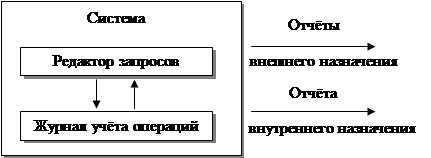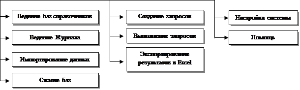 Рисунок 4.2 Как видно из рисунка ядро системы состоит из двух основных частей: 1) Журнал учёта операций – содержащий сведения о договорах купли-продажи, регистрации и агентских договорах между лицами различных форм собственности; 2) Редактор запросов – позволяющий формировать различные формы запросов на основе информации Журнала учёта операций. На вход системе поступают : 1) Требования и стандарты – от различных внешних законо и стандарто образующих организаций (НАУФОР, ФКЦБ); 2) Договора – заключаемые между лицами различных форм собственности; 3) Подтверждения из бухгалтерии – свидетельствующие о выплате или получении денег по сделке. На выходе имеем следующую информацию: 1) Отчёты внешнего назначения – предназначенные для налоговых и контролирующих организаций; 2) Отчёты внутреннего назначения – предназначенные для внутреннего учёта движения ЦБ. Внешними объектами по отношению к системе являются : - Федеральная комиссия по ценным бумагам; - Инвестиционные компании; - Вкладчики; - Законодательные органы; - Налоговые органы. 4.2 Функции системыВ результате анализа функциональных возможностей существующих программно-технологических комплексов и сопоставления их с требованиями НАУФОР и ФКЦБ и особенностями ведения внутреннего учёта в исследуемой инвестиционной компании, были выделены следующие функции, необходимые к реализации, они приведены на рисунке 4.3:
