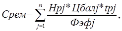 где Смодj - затраты на модернизацию j-го вида средств, руб.; aj - норма годовых амортизационных отчислений, %; Тслj - количество лет , отработанных j-м видом технических средств от момента установки до момента внедрения задачи. При расчете трудоемкости обработки информации по задаче необходимо учитывать частоту ее решения, т.е. сколько раз в год повторялся расчет. Годовая трудоемкость обработки информации по задаче рассчитывается по формуле: Tij = tij * Ui , (5.7) где tij- трудоемкость однократной обработки информации i-ой задачи на j-м виде технических средств, маш.-час.; Ui - периодичность решения i-ой задачи, раз в год. Коэффициент загрузки технических средств определяется по формуле: