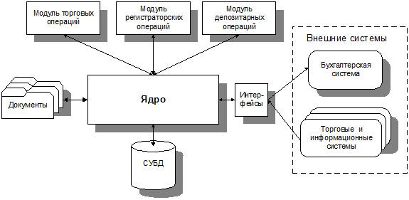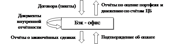 Рисунок 4.1 Бэк-офис является учетно-контролирующим звеном компании, следящим за выполнением взятых по сделкам обязательств и ведущим учёт ЦБ. Правильно организованная работа бэк-офиса позволяет компании экономить как время, так и деньги за счёт своевременно получаемой информации о состоянии портфеля ЦБ . 4.1.2 Основные задачи системы:На основе обзора программных комплексов были выявлены следующие основные задачи информационной системы по учету операций с ценными бумагами в бэк - офисе. * ведение базы данных клиентов компании, контрагентов, торговых систем и эмитентов; * ведение электронных журналов заключенных сделок; * ведение базы данных заключенных договоров, контроль их состояний; * учет находящихся в наличии ценных бумаг; * улаживания сделок, прохождения различных этапов оформления; * учет брокерских и дилерских операций; * формирование аналитической информации; * подготовка необходимой отчетности по стандарту НАУФОР · Книга учета ЦБ · Журнал учета ЦБ · Книга учета денежных средств · Журнал учета денежных средств · Журнал учета дилерских операций 4.1.3 Модель системыДля разработки информационной системы учёта ЦБ бэк-офисом в её основу планируется положить следующую модель представленную на рисунке 4.2 . Она характеризует основные компоненты системы , входные и выходные потоки.