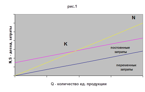 Условные обозначения: N - обьем производства продукции в стоимостном выражении; S - полная себестоимость продукции (затраты на производство); V - переменные расходы; К - точка критического обьема производства. Из этого соотношения определяется предельная величина физического обьема продукции по формуле: Q= C/P*VПреобразование формулы раскрывает связь обьема продукции и относительного маржинального дохода:
