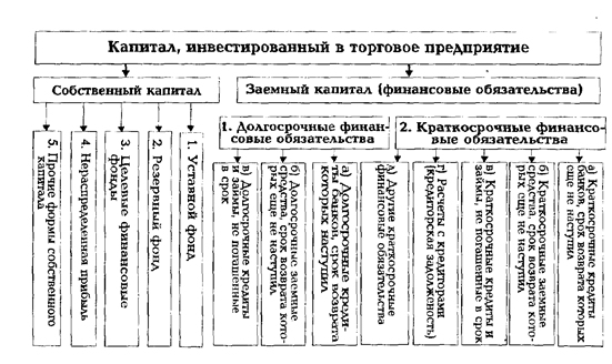 Рис. 9 Формы функционирования инвестированного капитала на торговом предприятии. 3. Целевые финансовые фонды. К ним относятся различные специальные фонды, формируемые на торговом предприятии с целью предстоящего целевого расходования накопленных финансовых средств. В составе этих фондов выделяют амортизационный фонд, фонд стимулирования труда, фонд производственного развития, фонд предстоящей уценки товаров и ряд других. Порядок формирования и использования средств этих фондов регулируется уставом и другими учредительными документами торгового предприятия. 4. Нераспределенная прибыль. Она представляет собой разницу между суммой полученной прибыли и распределенной ее частью, включая использованную. По своему экономическому содержанию она является одной из форм резерва собственных финансовых средств торгового предприятия. 5. Прочие формы собственного капитала. К ним относятся расчеты за имущество (при сдаче его в аренду), расчеты с участниками (по выплате им доходов в форме процентов или дивидендов) и некоторые другие, отражаемые в первом разделе пассива баланса. Заемный капитал торгового предприятия представлен следующими основными формами: 1. Долгосрочные финансовые обязательства. К ним относятся все формы привлеченного заемного капитала со сроком его использования более одного года. Основными формами этих обязательств являются долгосрочные кредиты банков и долгосрочные заемные средства (задолженность по налоговому кредиту, задолженность по финансовой помощи, предоставленной на возвратной основе и т.п.), срок погашения которых еще не наступил или не погашенные в предусмотренный срок. 2. Краткосрочные финансовые обязательства. К ним относятся все формы привлеченного заемного капитала со сроком его использования до одного года. Основными формами этих обязательств являются краткосрочные кредиты банков и краткосрочные заемные средства (как предусмотренные к погашению в предстоящем периоде, так и не погашенные в предусмотренный срок), различные формы кредиторской задолженности торгового предприятия (по товарам, работам и услугам; по выданным векселям; по полученным авансам; по расчетам с бюджетом и внебюджетными фондами; по оплате труда; с дочерними предприятиями; с другими кредиторами) и другие краткосрочные финансовые обязательства. В процессе формирования капитала торгового предприятия следует учитывать основные особенности каждой из его составных частей. Собственный капитал характеризуется следующими основными положительными особенностями: 1. Простотой привлечения, так как решения, связанные с увеличением собственного капитала, принимаются учредителями или менеджерами торгового предприятия без необходимости получения согласия других хозяйствующих субъектов. 2. Высокой отдачей по критерию нормы прибыли на вложенный капитал, так как в этом случае не требуется уплата ссудного процента (процента за кредит). 3. Снижением риска финансовой устойчивости и банкротства предприятия. Вместе с тем, ему присущи следующие недостатки: 1. Ограниченный объем привлечения, а следовательно и возможностей существенного расширения торговой деятельности при благоприятной конъюнктуре потребительского рынка. 2. Неиспользуемая возможность прироста рентабельности собственного капитала за счет эксплуатации зае