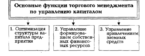 Рис. 10. Состав источников формирования финансовых структур ресурсов торгового предприятия. Источники формирования собственных финансовых ресурсов торгового предприятия подразделяются на внешние и внутренние. В составе внешних источников формирования собственных финансовых ресурсов основное место принадлежит привлечению дополнительного паевого (путем дополнительных взносов в уставный фонд) или акционерного (путем дополнительной эмиссии акций) капитала. Для отдельных торговых предприятий одним из внешних источников : может являться предоставленная ему безвозмездная финансовая помощь. В число прочих внешних источников входят бесплатно полученные материальные и нематериальные активы, включаемые в состав баланса торгового предприятия. В составе внутренних источников формирования собственных финансовых ресурсов основное место принадлежит прибыли, остающейся в распоряжении торгового предприятия (она формирует преимущественную часть всех собственных его финансовых ресурсов). Определенную роль в составе внутренних источников играют также амортизационные отчисления (особенно на предприятиях торговли с высокой стоимостью собственных основных средств и нематериальных активов). В число прочих внутренних источников входят суммы дооценки основных средств, нематериальных активов, запасов товаров и других материальных ценностей, а также некоторые другие источники, не играющие заметной роли в формировании собственных финансовых ресурсов. Источники привлечения заемных средств торгового предприятия также подразделяются на внешние и внутренние. В составе внешних источников привлечения заемных средств основная роль принадлежит финансовому и товарному кредитам, предоставленным торговому предприятию. Первый из них включает предоставление денежных средств на определенный срок под установленные проценты (банковский кредит, налоговой кредит, денежный кредит других субъектов предпринимательской деятельности и т.п.). Второй из них заключается в поставке товаров торговому предприятию на условиях отсрочки платежа за них. В число прочих внешних источников входят выпуск облигаций предприятия; предоставленные на беспроцентной основе средства государственных и негосударственных программ и фондов и некоторые другие. В составе внутренних источников привлечения заемных средств главное место занимает на предприятии прирост так называемых «устойчивых пассивов». Этот прирост заемных средств состоит из прироста задолженности по оплате труда (если предусмотрено увеличение фонда оплаты труда в плановом периоде); прироста задолженности по расчетам с бюджетом (если в связи с намечаемым ростом объема хозяйственной деятельности планируется увеличение суммы налоговых платежей); прироста задолженности по страхованию (если в плановом периоде возрастает стоимость имущества торгового предприятия, подлежащего обязательному страхованию) и некоторых других видов внутренней задолженности предприятия. Механизм образования устойчивых пассивов основан на том, что начисление соответствующих средств осуществляется ежедневно, а выплаты этих средств - с определенной (установленной) периодичностью. С учетом изложенного, содержание основных функций торгового менеджмента по управлению капиталом состоит в следующем (рис. 11).