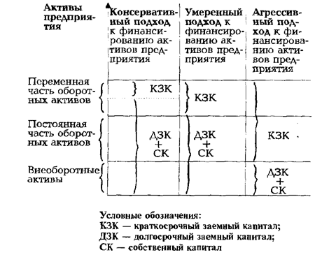 Рис. 13. Принципиальные подходы к финансированию активов торгового предприятия. а) Консервативный подход к. финансированию активов предполагает, что за счет собственного и долгосрочного заемного капитала должны финансироваться внеоборотные активы, постоянная часть оборотных активов и половина переменной части оборотных активов. Вторая половина переменной части оборотных активов должна финансироваться за счет краткосрочного заемного капитала. Такая модель финансирования активов обеспечивает высокий уровень финансовой устойчивости предприятия в процессе его развития. б) Умеренный подход к финансированию активов предполагает, что за счет собственного и долгосрочного заемного капитала должны финансироваться внеоборотные активы и постоянная часть оборотных активов, в то время как за счет краткосрочного заемного капитала - весь объем переменной части оборотных активов. Такая модель финансирования активов обеспечивает приемлемый уровень финансовой устойчивости предприятия. в) Агрессивный подход к финансированию активов предполагает, что за счет собственного и долгосрочного заемного капитала должны финансироваться только внеоборотные активы, в то время как все оборотные активы должны финансироваться за счет краткосрочного заемного капитала (по принципу: текущие активы должны покрываться текущими обязательствами). Такая модель финансирования активов создает серьезные проблемы в обеспечении платежеспособности и финансовой устойчивости предприятия, хотя позволяет осуществлять торговую деятельность с минимальной потребностью в собственном капитале. В зависимости от своего отношения к финансовым рискам владельцы или менеджеры торгового предприятия избирают один из рассмотренных вариантов финансирования активов. Учитывая, что на современном этапе долгосрочные займы и ссуды торговым предприятиям практически не предоставляются, избранная модель финансирования активов будет представлять соотношение собственного и заемного (краткосрочного) капитала, т.е. оптимизировать его структуру с этих позиций. 4. Оптимизация структуры капитала по критерию его стоимости. Стоимость капитала представляет собой среднюю цену, которую торговое предприятие платит за его привлечение из различных источников. Капитал торгового предприятия формируется за счет разных источников. Соответственно дифференцируется и стоимость его привлечения из отдельных источников. Так, стоимость привлечения капитала за счет собственных внутренних источников оценивается отношением суммы чистой прибыли к сумме собственного капитала в процентах; стоимость привлечения капитала за счет собственных внешних источников - отношением суммы выплат доходов (дивидендов, процентов) к сумме вложенного капитала в процентах; стоимость привлечения финансового кредита - размером процентов за кредит; стоимость привлечения товарного кредита - размером ценовой скидки в процентах при поставках товаров с немедленным расчетом; стоимость привлечения устойчивых пассивов приравнена к нулю. В процессе оптимизации структуры капитала по этому критерию исходят из возможностей минимизации средневзвешенной стоимости капитала торгового предприятия. Этот показатель на предприятиях торговли рассчитывается по следующей формуле: Сквнут х Усвнут + Сквнеш х Усв