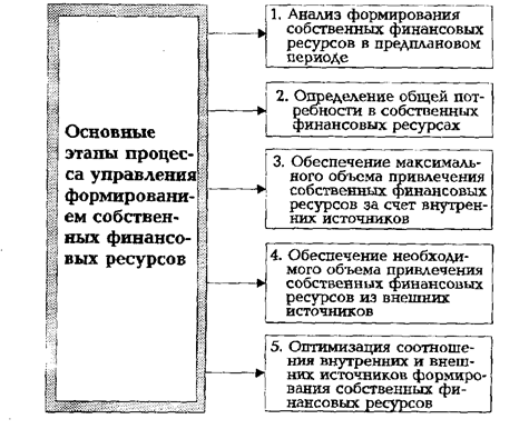 Рис. 14. Содержание основных этапов внутренних и внешних источников формирования собственных финансовых ресурсов. D СФР Ксф = ----------------, D ФП где Ксф - коэффициент самофинансирования развития торгового предприятия; D СФР - общая сумма собственных финансовых ресурсов, сформированных в рассматриваемом периоде; D ФР - общая сумма всех финансовых ресурсов, сформированных в рассматриваемом периоде. Динамика этого показателя будет отражать тенденцию обеспеченности развития торгового предприятия собственными финансовыми ресурсами. 2 Определение общей потребности в собственных финансовых ресурсах. С учетом ранее рассчитанных плановых показателей эта потребность определяется по следующей формуле: Пк х Уск Псфр = --------------- - СКн + Пр, 100 где Псфр - общая потребность в собственных финансовых ресурсах торгового предприятия в планируемом периоде; Пк - общая потребность в капитале на конец планируемого периода; Уск - планируемый удельный вес собственного капитала в общей его сумме (в соответствии с оптимизированной финансовой структурой капитала); СКн - сумма собственного капитала на начало планируемого периода; Пр - сумма прибыли, направляемая на потребление в плановом периоде. Рассчитанная общая потребность охватывает необходимую сумму собственных финансовых ресурсов, формируемых как за счет внутренних, так и за счет внешних источников. 3. Обеспечение максимального объема привлечения собственных финансовых ресурсов за счет внутренних источников. До того, как обращаться к внешним источникам формирования собственных финансовых ресурсов, должны быть реализованы все возможности их формирования за счет внутренних источников. Так как основными планируемыми внутренними источниками формирования собственных финансовых ресурсов торгового предприятия являются сумма чистой прибыли и амортизационных отчислений, то в первую очередь следует в процессе планирования этих показателей предусмотреть возможности их роста за счет различных резервов. В последние годы торговым предприятиям разрешено применять метод ускоренной амортизации активной части основных средств, что увеличивает возможности формирования собственных финансовых ресурсов за счет этого источника. Однако следует иметь в виду, что рост суммы амортизационных отчислений в процессе проведения ускоренной амортизации отдельных видов основных средств приводит к соответствующему уменьшению суммы чистой прибыли. Поэтому при изыскании резервов роста собственных финансовых ресурсов за счет внутренних источников следует исходить из необходимости максимизации совокупной их суммы, т.е. из следующего критерия: ЧП + АО ————— СФРмакс., где ЧП - планируемая сумма чистой прибыли предприятия; АО - планируемая сумма амортизационных отчислений; СФРмакс. - максимальная сумма собственных финансовых ресурсов, формируемых за счет внутренних источников. 4. Обеспечение необходимого объема привлечения собственных финансовых ресурсов из внешних источников. Объем привлечения собственных финансовых ресурсов из внешних источников призван обеспечить ту их часть, которую не удалось сформировать за счет внутренних источников финансирования. Если сумма привлекаемых за счет внутренних источников собственных финансовых ресурсов полностью обеспечивает общую потребность в них в плановом п