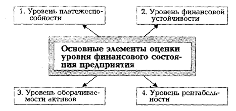 Рис. 16. Состав основных элементов оценки уровня финансового состояния торгового предприятия. 1. Уровень платежеспособности. Он позволяет охарактеризовать возможности торгового предприятия своевременно расплачиваться по своим финансовым обязательствам в зависимости от состояния ликвидности активов. Проведение такой оценки требует предварительной группировки активов торгового предприятия по уровню ликвидности, а его обязательств - по срочности погашения. Для оценки уровня платежеспособности торгового предприятия используются следующие основные финансовые коэффициенты: а) коэффициент абсолютной платежеспособности («кислотный тест»). Он показывает, в какой степени неотложные финансовые обязательства торгового предприятия обеспечены имеющимися у него готовыми средствами платежа. Расчет этого коэффициента производится по формуле: А1 КАП = --------, О1 где КАП - коэффициент абсолютной платежеспособности («кислотный тест»); А1 - сумма готовых средств платежа (денежных активов и краткосрочных финансовых вложений); О1 - сумма неотложных (со сроком погашения до одного месяца) финансовых обязательств предприятия; 6) коэффициент промежуточной платежеспособности. Он показывает, в какой степени все краткосрочные финансовые обязательства торгового предприятия могут быть удовлетворены за счет его высоколиквидных активов и готовых средств платежа. Расчет этого коэффициента осуществляется по формуле: А2 КПП = ----------, О2 где КПП - коэффициент промежуточной платежеспособности; A2 - сумма готовых средств платежа и оборотных активов в высоколиквидной форме; 02 - сумма неотложных и других краткосрочных (со сроком погашения до 3-х месяцев) финансовых обязательств предприятия; в) коэффициент текущей платежеспособности. Он показывает, в какой степени вся текущая задолженность торгового предприятия (сумма краткосрочных заемных средств) может быть удовлетворена за счет всех его текущих (оборотных) активов. Расчет этого показателя осуществляется по формуле: ОА КТП = -------------, КЗС где КТП - коэффициент текущей платежеспособности; ОА - сумма оборотных активов предприятия; КЗС - сумма краткосрочных заемных средств, используемых предприятием. 2. Уровень финансовой устойчивости. Он позволяет определить уровень хозяйственного риска, связанного с формированием структуры источников капитала торгового предприятия, а соответственно и степень стабильности финансового обеспечения развития предприятия в предстоящем периоде. Для проведения оценки уровня финансовой устойчивости торгового предприятия используются следующие основные финансовые коэффициенты: а) коэффициент автономии (КА). Он показывает в какой степени объем используемых торговым предприятием активов сформирован за счет собственного капитала и насколько оно независимо от внешних источников финансирования. Алгоритм расчета этого показателя рассмотрен ранее; б) коэффициент финансирования (КФ). Он показывает какой размер заемных средств (долгосрочных и краткосрочных) приходится на единицу собственного капитала, т.е. характеризует степень зависимости торгового капитала от внешних источников финансирования. Алгоритм расчета этого показателя рассмотрен ранее; в) коэффициент долгосрочной финансовой независимости. Он показывает, в какой степени общий объем используемых активов сфор