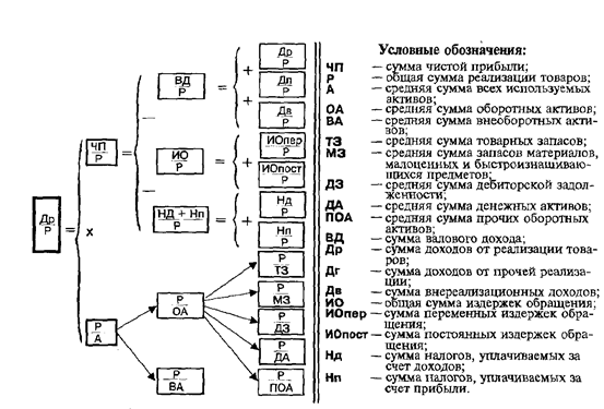 Рис. 17. Схема финансового анализа по методике корпорации «Дюпон» (применительно к торговым предприятиям). В соответствии с этой моделью коэффициент рентабельности всех используемых активов торгового предприятия определяется произведением коэффициента рентабельности реализации товаров на коэффициент оборачиваемости всех используемых активов: Ра = Рр х КОа, Для интерпретации результатов интегральной оценки финансового состояния торгового предприятия может быть использована специальная матрица, представленная на рис. 18. С помощью указанной матрицы можно выявить основные резервы дальнейшего повышения эффективности хозяйственной деятельности торгового предприятия (роста коэффициента рентабельности использования его активов) за счет оптимизации отдельных экономических и финансовых показателей в предстоящем периоде. Финансовое планирование. Оптимизация финансового состояния торгового предприятия обеспечивается в процессе финансового планирования. Финансовое планирование представляет собой процесс разработки системы мероприятий по обеспечению развитю торгового предприятия необходимыми финансовыми ресурсами, сбалансированности их источников и повышению эффективности финансовой деятельности в предстоящем периоде.