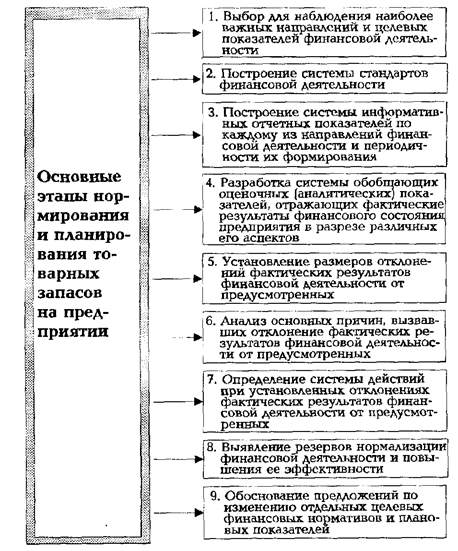 Рис. 18 Содержание основных этапов построения системы мониторинга. 1. Выбор для наблюдения наиболее важных направлений и целевых показателей финансовой деятельности. В процессе такого выбора необходимо ориентироваться в первую очередь на целевые финансовые нормативы и систему показателей, характеризующих различные аспекты финансового состояния торгового предприятия. 2. Построение системы стандартов финансовой деятельности. В качестве таких стандартов выступают разработанные критерии по отдельным аспектам финансовой деятельности (например, по политике финансирования активов, формированию финансовой структуры капитала и т.п.); целевые стратегические нормативы; показатели текущих и оперативных финансовых планов, избранные для наблюдения. 3. Построение системы информативных отчетных показателей по каждому из направлений финансовой деятельности и периодичности их формирования. Такая система показателей должна основываться на данных финансового и управленческого учета. Она представляет собой так называемую «первичную информационную базу наблюдения», необходимую для последующего расчета отдельных аналитических показателей, характеризующих уровень финансового состояния торгового предприятия в разрезе различных его аспектов. Периодичность формирования первичной базы данных определяется «срочностью реагирования», т.е. своевременностью осуществления внутреннего контроля за отдельными аспектами финансовой деятельности. С учетом такого принципа подхода к периодичности формирования первичной информационной базы наблюдения выделяют: а) оперативную (недельную, декадную) сводку; б) месячный отчет; в) квартальный отчет (показатели годовой отчетности не являются объектом текущего мониторинга финансовой деятельности). 4. Разработка системы обобщающих оценочных (аналитических) показателей, отражающих фактические результаты финансового состояния предприятия в разрезе различных его аспектов. Система обобщающих оценочных показателей должна полностью корреспондировать с наблюдаемыми направлениями финансовой деятельности, целевыми финансовыми нормативами и плановыми показателями, характеризующими различные аспекты финансового состояния торгового предприятия. В процессе разработки такой системы строятся алгоритмы расчета отдельных оценочных показателей с использованием первичной информационной базы наблюдения и методов финансового анализа. 5. Установление размеров отклонений фактических результатов финансовой деятельности от предусмотренных. Размеры отклонений рассчитываются в абсолютных и относительных показателях. На каждом торговом предприятии должен быть определен критерий «критических отклонений», который может быть дифференцирован по периодам осуществления оценки. В качестве критерия «критических отклонений» может быть принято отклонение в размере 20 и более процентов по недельному (декадному) периоду; 15 и более процентов по месячному периоду; 10 и более процентов - по квартальному периоду. 6. Анализ основных причин, вызвавших отклонение фактических результатов финансовой деятельности от предусмотренных. В процессе такого анализа в первую очередь выделяются и рассматриваются те показатели финансового состояния торгового предприятия, по которым наблюдаются «критические отклонения