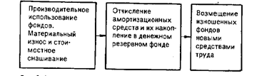 Рис. 2. Оборот основных средств. Денежные средства, авансированные на приобретение основных фондов, называются основными средствами (основной капитал). Следует отметить, что вложения денежных средств в фонды осуществляются авансом, поэтому понятие вложенных средств адекватно понятию авансированных средств. В зависимости от целевого назначения, роли и выполняемых функций в производственном процессе основные фонды классифицируются по определенным группам. Типовая классификация основных производственных фондов включает 12 групп: здания; сооружения; передаточные устройства; машины и оборудование - всего, из них - силовые машины и оборудование» рабочие машины и оборудование, измерительные и регулирующие приборы и устройства и лабораторное оборудование, вычислительная техника, машины и оборудование автоматические; транспортные средства; инструмент; производственный и хозяйственный инвентарь и др., в том числе земельные участки, находящиеся в собственности хозяйствующего субъекта. Соотношение отдельных видов основных фондов в соответствии с принятой классификацией составляет структуру фондов, которая характеризуется удельным весом стоимости каждой группы в общем объеме производственных основных фондов. В составе основных производственных фондов различаются активная и пассивная части. Активные основные фонды непосредственно воздействуют на продукт, определяют масштабы его производства и уровень производительности труда работников. К ним относятся, прежде всего, машины и оборудование, инструмент. Пассивная часть основных фондов охватывает те из них, которые создают необходимые условия для процесса труда: здания, сооружения, передаточные устройства и т.п. Соотношение между активной и пассивной частями основных фондов зависит от особенностей технологического процесса в отдельных отраслях народного хозяйства и уровня их технической оснащенности. Деление основных фондов на активные и пассивные в определенной мере условно и зависит от специфики функций, выполняемых отраслью. Нематериальные активы. Нематериальные активы представляют вложение денежных средств предприятия (его затраты) в нематериальные объекты, используемые в течение долгосрочного периода в хозяйственной деятельности и приносящие доход. Таким образом, нематериальные активы - это стоимость объектов промышленной и интеллектуальной собственности и иных имущественных прав. К нематериальным активам относятся права пользования земельными участками, природными ресурсами, патенты, лицензии, «ноу-хау», программное обеспечение, авторские права, монопольные права и привилегии (включая права на изобретения» патент, лицензию на определенные виды деятельности, промышленные образцы, модели, использование художественно-конструкторских решений», организационные расходы (включая плату за государственную регистрацию предприятия, брокерское место и т.п.), торговые марки, товарные и фирменные знаки, цена фирмы. По характеру применения нематериальные активы похожи на основные средства. Они используются длительный период, приносят прибыль, и с течением времени большая часть из них теряет свою стоимость. Особенностью нематериальных активов являются отсутствие материально-вещественной структуры, сложность определения стоимости, большая неопределен