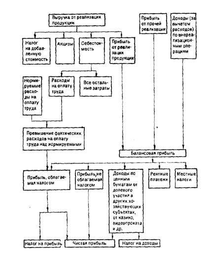 Рис.3. Схема формирования чистой прибыли хозяйствующего субъекта. Консолидированная отчетность имеет две основные особенности. 1. Она не является отчетностью юридически самостоятельного хозяйствующего субъекта и имеет явно выраженную аналитическую направленность. Цель такой отчетности заключается не в выявлении налогооблагаемой прибыли, а в получении общего представления о деятельности корпоративной семьи хозяйствующих субъектов. 2. Консолидация - это не простое суммирование одноименных статей финансовой отчетности хозяйствующих субъектов корпоративной семьи. В процессе консолидации исключаются любые внутрикорпоративные финансово-хозяйственные операции, и в консолидированной отчетности показываются лишь активы и пассивы, доходы и расходы от операций с третьими лицами, Прибыль от реализации продукции (товаров, работ, услуг) представляет собой разницу между выручкой от реализации продукции без налога на добавленную стоимость специального налога, акцизов, экспортных тарифов (для экспортной выручки) и затратами на производство и реализацию, включаемыми в себестоимость продукции. Выручка от реализации продукции определяется либо по мере ее оплаты (при безналичных расчетах - по мере поступления денежных средств за товары на счета в учреждения банков, а при расчетах наличными деньгами - по поступлении средств в кассу), либо по мере отгрузки товаров (продукции, работ, услуг) и предъявления покупателю (заказчику) расчетных документов. Метод определения выручки от реализации продукции устанавливается предприятием на длительный срок (ряд лет) исходя из условий хозяйствования и заключенных договоров. Валютная выручка, остающаяся в распоряжении хозяйствующего субъекта и перечисленная на его валютный счет, пересчитывается г рубли по курсу, котируемому Центральным банком России. В отраслях сферы товарного обращения (торговля, общественное питание, материально-техническое снабжение, заготовки) вместо категории «выручка от реализации продукции» используется категория «товарооборот». Сущность товарооборота составляют экономические отношения, связанные с обменом денежных доходов на товары в порядке купли-продажи. В зарубежной практике зачастую вместо термина «выручка» используется термин «валовой доход». Однако это очень широкая трактовка данного термина. Валовой доход как экономическая категория выражает собой вновь созданную стоимость, или чистую продукцию хозяйствующего субъекта. В практике планирования и учета в торговле под валовым доходом понимается сумма торговых надбавок (скидок); в общественном питании - сумма торговых надбавок (скидок) и наценок. Себестоимость продукции {работ, услуг) представляет собой стоимостную оценку используемых в процессе производства продукции природных ресурсов, сырья, материалов, топлива, энергии, основных фондов, трудовых ресурсов, а также других затрат на ее производство и реализацию. Полная характеристика состава всех затрат, входящих в себестоимость, приводится в Положении о составе затрат по производству и реализации продукции (работ, услуг), включаемых в себестоимость продукции (работ, услуг), н о порядке формирования финансовых результатов, учитываемых при налогообложении прибыли, утвержденном постановлением Правительства РФ от 5 августа 1992 г. № 552. Затраты, вх