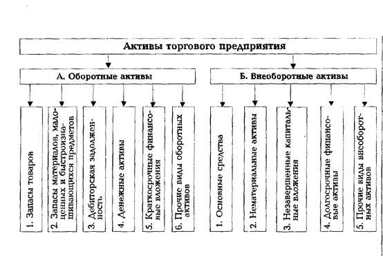 Рис. 6. Состав активов торгового предприятия в разрере отдельных их видов. Так в составе оборотных активов торгового предприятия выделяют следующие их виды: 1. Запасы товаров. К ним относятся товарные запасы всех видов, предназначенные для реализации. В составе баланса они отражаются как по покупной (в ценах закупки), так и по продажной (в ценах возможной реализации) стоимости. 2. Запасы материалов, малоценных и быстроизнашивающихся предметов. В состав материалов включаются разнообразные их виды, предназначенные для ремонта; упаковочные материалы. В состав малоценных и быстроизнашивающихся предметов входят средства труда со сроком эксплуатации до одного года и стоимостью до 15 необлагаемых налогом минимумов доходов граждан. 3. Дебиторская задолженность (расчеты с дебиторами). К ней относится задолженность юридических и физических лиц торговому предприятию за товары и других видов. 4. Денежные активы. К ним относятся денежные средства торгового предприятия в кассе, на расчетном и валютном его счетах и в других формах. 5. Краткосрочные финансовые вложения. В их состав входят вложения средств предприятия в различные ценные бумаги, на депозитные счета в банках и т.п. на срок менее одного года. По своему экономическому содержанию они представляют собой форму временного использования свободных денежных активов торгового предприятия с целью получения доходов по ним в краткосрочном периоде. 6. Прочие виды оборотных активов. К ним относятся расходы будущих периодов (затраты, произведенные в данном отчетном периоде, но которые будут отнесены на издержки обращения в будущих отчетных периодах) и некоторые другие их виды. В составе внеоборотных активов торгового предприятия выделяют такие их виды: 1. Основные средства. В их состав входят принадлежащие торговому предприятию средства труда в форме зданий, помещений, машин, механизмов, оборудования и других со сроком службы более одного года и стоимостью свыше 15 необлагаемых налогом минимумов доходов граждан. 1. Нематериальные активы. К ним относятся приобретенные торговым предприятием права пользования товарными знаками, патентами, лицензиями, «ноу-хау», авторскими правами и другие аналогичные имущественные права. 3. Незавершенные капитальные вложения. К ним относятся незавершенные реальные инвестиции торгового предприятия в новое строительство, реконструкцию помещений и другие реальные объекты. 4. Долгосрочные финансовые вложения. К ним относятся долгосрочные (на срок более одного года) финансовые инвестиции торгового предприятия в уставные фонды совместных предприятий, в разнообразные фондовые и денежные инструменты (акции, долгосрочные облигации, долгосрочные депозитные вклады и т.п.). 5. Прочие виды внеоборотных активов. В их состав входят оборудование, предназначенное к установке, расчеты с участниками и некоторые другие их виды. Формирование активов торгового предприятия связано с тремя основными этапами его развития: 1) созданием нового предприятия: 2) реконструкцией и модернизацией действующего предприятия; 3) созданием новых структурных единиц (магазинов, филиалов и т.п.) действующего предприятия. Второй и третий этапы формирования активов представляют собой формы инвестиционной деятельности предприятия. Определение потребности в отдельных видах активов нового тор