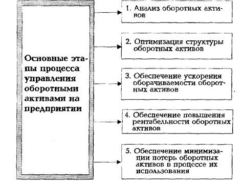 Рис. 7. Содержание основных этапов процесса управления оборотными активами на торговом предприятии. 1. Анализ оборотных активов. Целью этого анализа является выявление тенденций динамики общего их объема и состава, а также изучение эффективности их использования. На первом этапе анализа рассматривается динамика общего объема оборотных активов торгового предприятия - темпы изменения общей суммы оборотных активов в сопоставлении с темпами изменения объема реализации товаров; удельного веса оборотных активов в общей сумме активов предприятия. На втором этапе анализа рассматривается динамика состава оборотных активов торгового предприятия в разрезе следующих их видов: а) средства, авансированные в товарные запасы; б) средства, отвлеченные в дебиторскую задолженность; в) денежные средства; г) прочие виды оборотных активов. В процессе этого анализа рассчитываются и изучаются темпы изменения их суммы, а также удельный вес отдельных видов оборотных активов в общей их сумме. Анализ состава оборотных активов торгового предприятия по отдельным их видам позволяет оценить уровень их ликвидности. На третьем этапе анализа изучается эффективность использования оборотных активов торгового предприятия. Эта эффективность характеризуется тремя важнейшими показателями - коэффициентом оборачиваемости оборотных активов; периодом оборота оборотных активов; уровнем рентабельности оборотных активов. Коэффициент оборачиваемости оборотных активов определяется по следующей формуле: Р Кооа = -------------, ОА где КОоа - коэффициент оборачиваемости оборотных активов в рассматриваемом периоде; Р - объем реализации товаров на предприятии в рассматриваемом периоде; ОА - средняя сумма оборотных активов в рассматриваемом периоде (она рассчитывается по формуле средней хронологической). Период оборота оборотных активов рассчитывается по следующим формулам: ОА Д Пооа = --------- или Пооа = ----------------, Ро КОоа где ПОоа - период оборота оборотных активов в днях; ОА - средняя сумма оборотных активов в рассматриваемом периоде; Ро - однодневный объем реализации товаров в рассматриваемом периоде; Д - число дней в рассматриваемом периоде (360 - в году, 90 - в квартале, 30 - в месяце); КОоа - коэффициент оборачиваемости оборотных активов. Уровень рентабельности оборотных активов вычисляется по следующей формуле: П х 100 Уроа = ------------------, ОА где УРоа - уровень рентабельности оборотных активов, в %; П - сумма прибыли предприятия в рассматриваемом периоде: ОА - средняя сумма оборотных активов в рассматриваемом периоде. В процессе анализа динамики показателей эффективности использования оборотных активов изучаются основные факторы, вызвавшие их изменение (изменение объема реализации товаров; изменение общей суммы и состава этих активов и т.п.). 2. Оптимизация структуры оборотных активов. Процесс этой оптимизации охватывает два основных этапа. На первом этапе оптимизации на торговом предприятии рассчитываются нормативы отдельных видов оборотных активов, в первую очередь, средств, авансируемых в товарные запасы, отвлекаемых в дебиторскую задолженность и хранимых в форме остатка денежных средств (принципы их нормирования рассматриваются далее). Объем нормируемых средств отдельных видов оборотных активов определяется в первую очередь планируемым объемом реализации товаро