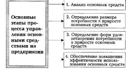 Рис. 8. Содержание основных этапов процесса управления основными средствами на торговом предприятии. 1. Анализ основных средств. На предприятиях торговли этот анализ проводится в целях изучения динамики общего их объема и состава, а также эффективности их использования. На первом этапе анализа изучается динамика общей суммы основных средств, используемых на предприятии, выявляются темпы этой динамики в сопоставлении с темпами изменения объема товарооборота и общей суммы активов, определяются изменения удельного веса основных средств в общей сумме внеоборотных и совокупных активов предприятия. На втором этапе анализа изучается состав основных средств торгового предприятия и динамика отдельных их видов. В процессе этого анализа основные средства предприятия подразделяют на активные и пассивные их виды. К активным относят машины, механизмы, оборудование и инвентарь, используемые в торгово-технологическом процессе. К пассивным относят здания, торговые помещения и сооружения, используемые торговым предприятием в процессе своей хозяйственной деятельности. Важнейшим показателем оценки состава основных средств является удельный вес активной части в общей их сумме. На третьем этапе анализа определяется степень изношенности основных средств, характеризующая их «возраст». В этих целях рассчитываются коэффициент износа и коэффициент годности основных средств: Иос ОСо Киос = ------------; Кгос = -----------------, ОС ОС где Киос - коэффициент износа основных средств; Кгос - коэффициент годности основных средств; Иос - сумма износа основных средств; ОСо - остаточная стоимость основных средств; ОС - первоначальная (восстановительная) стоимость основных средств. Расчет этих коэффициентов осуществляется по основным средствам в целом, отдельным их видам и разновидностям. На четвертом этапе анализа изучается интенсивность обновления основных фондов торгового предприятия. Эта интенсивность характеризуется рядом показателей, основными из которых являются: а) коэффициент обновления основных средств. Он характеризует долю новых основных средств в общей их сумме и рассчитывается по формуле: ОСн Кобн = -----------, ОСк где Кобн - коэффициент обновления основных средств; ОСн - стоимость вновь введенных основных средств в отчетном периоде; ОСк - стоимость основных средств на конец отчетного периода; б) коэффициент выбытия основных средств. Он характеризует долю выбывших основных средств в общей их сумме и рассчитывается по формуле: ОСв Квыб = ---------------, ОКк где Квыб - коэффициент выбытия основных средств; ОСв - стоимость выбывших основных средств в отчетном периоде; ОСк - стоимость основных средств на конец отчетного периода; в) скорость обновления основных средств. Она характеризует средний период времени полного обновления всех основных средств. Расчет этого показателя осуществляется по формуле: 1 Соос = -------------, Кобн где СОос - скорость обновления основных средств; Кобн - коэффициент обновления основных средств. Указанные показатели рассчитываются в процессе анализа по основным средствам в целом, в том числе по активной их части. На пятом этапе анализа изучается эффективность использования основных средств. Важнейшими показателями, характеризующими эту эффективность, являются: а) фондоотдача. Она характеризует объем реализации товаров в расчете 