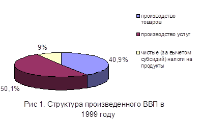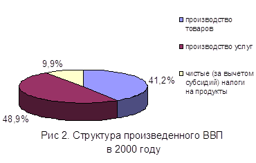 Структура ВВП в 2000 году характеризовалась опережающим ростом доли отраслей, производящих товары. В структуре ВВП, рассчитанному по производственному методу, доля производства товаров составила 41,2% против 40,9% за 1999 год, а доля производства услуг, соответственно, - 48,9% против 50,1%. Доля чистых (за вычетом субсидий) налогов на продукты составила 9,9% против 9,0% в 1999 году (см. рис. 1,2 и табл. 1).