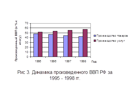 Так как увеличивается производство товаров, следовательно, имеет место рост промышленного производства. Его можно объяснить тем, что российская промышленность вступила в 2000 год на фоне заметного увеличения темпов выпуска продукции в 1999 году, обусловленного эффектом девальвации российского рубля (расширение поставок на экспорт продукции ряда отраслей, развитие процесса импортозамещения), улучшением финансового положения промышленных предприятий и рядом других факторов, в том числе расширением внутреннего спроса – инвестиционного и потребительского, и наращиванием объемов экспорта. Однако, за последние 6 лет наблюдался другой процесс – уменьшение доли отраслей, производящих товары и увеличение доли отраслей, производящих различные услуги (см. рис. 3 и таблицу 2). Таблица 2 Структура производства валового внутреннего продукта по отраслям в 1995 – 1998 годах (в % к итогу)