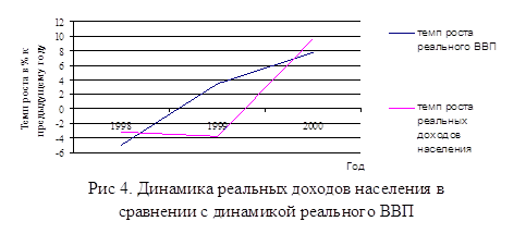 *) Некоммерческие организации, обслуживающие домашние хозяйства Расширение платежеспособного спроса домашних хозяйств было обеспечено за счет роста реальных располагаемых денежных доходов, который носил "догоняющий" характер и компенсировал их стагнацию в 1999 году (см. рис. 4). При этом к концу 2000 года потребительский спрос начал все в большей мере переключаться на импортные товары вследствие опережающего роста цен на отечественные товары относительно динамики изменения курса доллара.
