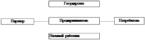 Рисунок 1 Субъекты предпринимательской деятельности Во взаимоотношениях предпринимателя и потребителя предприниматель относится к категории активного субъекта, а потребителю свойственна прежде всего пассивная роль. При анализе стороны этих взаимоотношений потребитель выполняет роль индикатора предпринимательского процесса. Это понятно, поэтому все то, что составляет предмет деятельности предпринимателя, имеет право на реализацию только в случае позитивной (положительной) экспертной оценки потребителя. Такая оценка осуществляется потребителем и выступает как готовность последнего приобрести тот или иной товар. Предприниматель, при планировании и организации своей деятельности никоим образом не может игнорировать настроения, желания, интересы, ожидания, оценки потребителя. Таким образом, целью предпринимателя выступает необходимость "завоевать' потребителя, создать круг собственных потребителей. Основными средствами воздействия предпринимателя на потребителя выступают следующие факторы: • новизна товара и его соответствие интересу потребителя; • качество; • цена, доступность товара; • степень универсальности товара; • внешний вид и упаковка; • позитивные отличительные характеристики товара от товаров других производителей и возможность потребителя ознакомиться с такими отличиями; • возможность воспользоваться услугами послепродажного сервиса; • соответствие общепринятым или государственным стандартам; • престижность и привлекательность рекламы товара и т. д. Вывод, который можно было бы сделать из рассматриваемой проблемы, сводится к следующему: если с точки зрения общественного производства именно предприниматель выступает в роли активного субъекта, то с точки зрения самого предпринимательского процесса, его содержания и эффективности активную роль играет потребитель, и предприниматель не может игнорировать этот факт.. Роль государства как субъекта предпринимательского процесса может быть различной в зависимости от общественных условий, ситуации, складывающейся в сфере деловой активности, и тех целей, какие ставит перед собой государство. В зависимости от конкретной ситуации государство может быть: • тормозом развития предпринимательства, когда оно создает крайне неблагоприятную обстановку для развития предпринимательства или даже запрещает его; • посторонним наблюдателем, когда государство прямо не противодействует развитию предпринимательства, но в то же время и не способствует этому развитию; • ускорителем предпринимательского процесса, когда государство ведет постоянный и активный поиск мер по вовлечению в предпринимательский процесс новых экономических агентов (нередко такая целенаправленная деятельность государства вызывает "взрыв" предпринимательской активности и приводит к "буму" предпринимательства). Наемный работник как реализатор идей предпринимателя также относится к группе субъектов предпринимательского процесса. Именно от него зависит эффективность и качество реализации предпринимательской идеи. Известно, что каждому экономическому субъекту свойственны свои собственные интересы. Что касается предпринимателя и наемного работника, то часть их планов совпадает (чем выше прибыль, тем выше заработная плата, к примеру), а часть носит полярно противополож