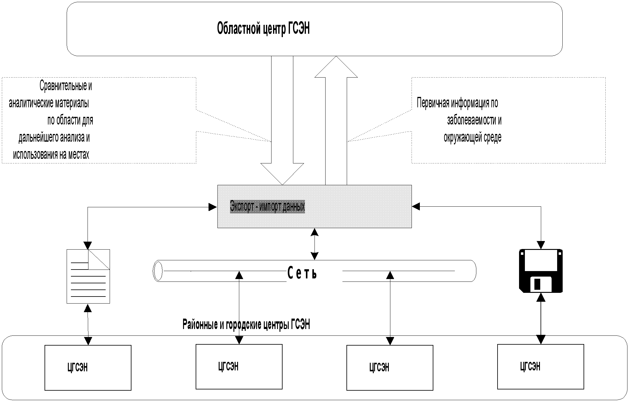 Согласно приказу Министра здравоохранения Российской Федерации № 334 от 27.08.99г. информация о состоянии здоровья является составной частью социально-гигиенического мониторинга (СГМ). Вся информация о состоянии среды и здоровья населения собирается, обрабатывается и анализируется в Федеральном Центре Госсанэпиднадзора. Материалы СГМ широко используются в государственном и региональных докладах о санэпидблагополучии населения, других аналитических материалах, публикуются в информационных сборниках. Основной слабостью существующей информационной системы здравоохранения является отсутствие повседневного контроля качества диагностики, регистрации и кодирования данных, ввода и управления данными. Двух- или трехкратное обобщение данных при передаче их с самого низкого уровня до федерального уровня приводит к потере важной информации. На первом этапе СГМ (1995 - 1999 гг.) в России были проведены все необходимые организационные мероприятия, второй же этап характеризуется внедрением нормативно-методических документов, которые позволят унифицировать сбор и обработку информации, поступающей в систему СГМ с местного до федерального уровней. Для совершенствования сбора и обработки информации в рамках СГМ необходимо: