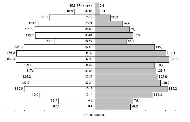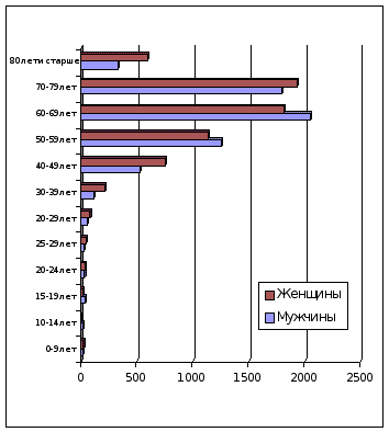 4.Медико-демографические показатели. Важнейшими параметрами, характеризующими состояние здоровья населения, являются медико-демографические критерии, по большинству из которых в последнее время на территории Нижегородской области наблюдается неблагоприятная ситуация. Численность постоянного населения Нижегородской области по утвержденным Госкомстатом данным на начало 2003 г. составила 3561,6 тыс. человек, из них 1622,0 тыс. мужчин (45,5%) и 1939,6 тыс. женщин (54,5%) (см.диаграмму 1). Нижегородская область относится к числу высокоурбанизированных регионов России: всего в составе населения области 2794,7 тыс. горожан (78,5%) и 766,9 тысячи сельских жителей (21,5%). В областном центре, г.Нижнем Новгороде, проживает 37,1% населения области. Диаграмма Повозрастная структура населения Нижегородской области (на 01.01.2003 г.)