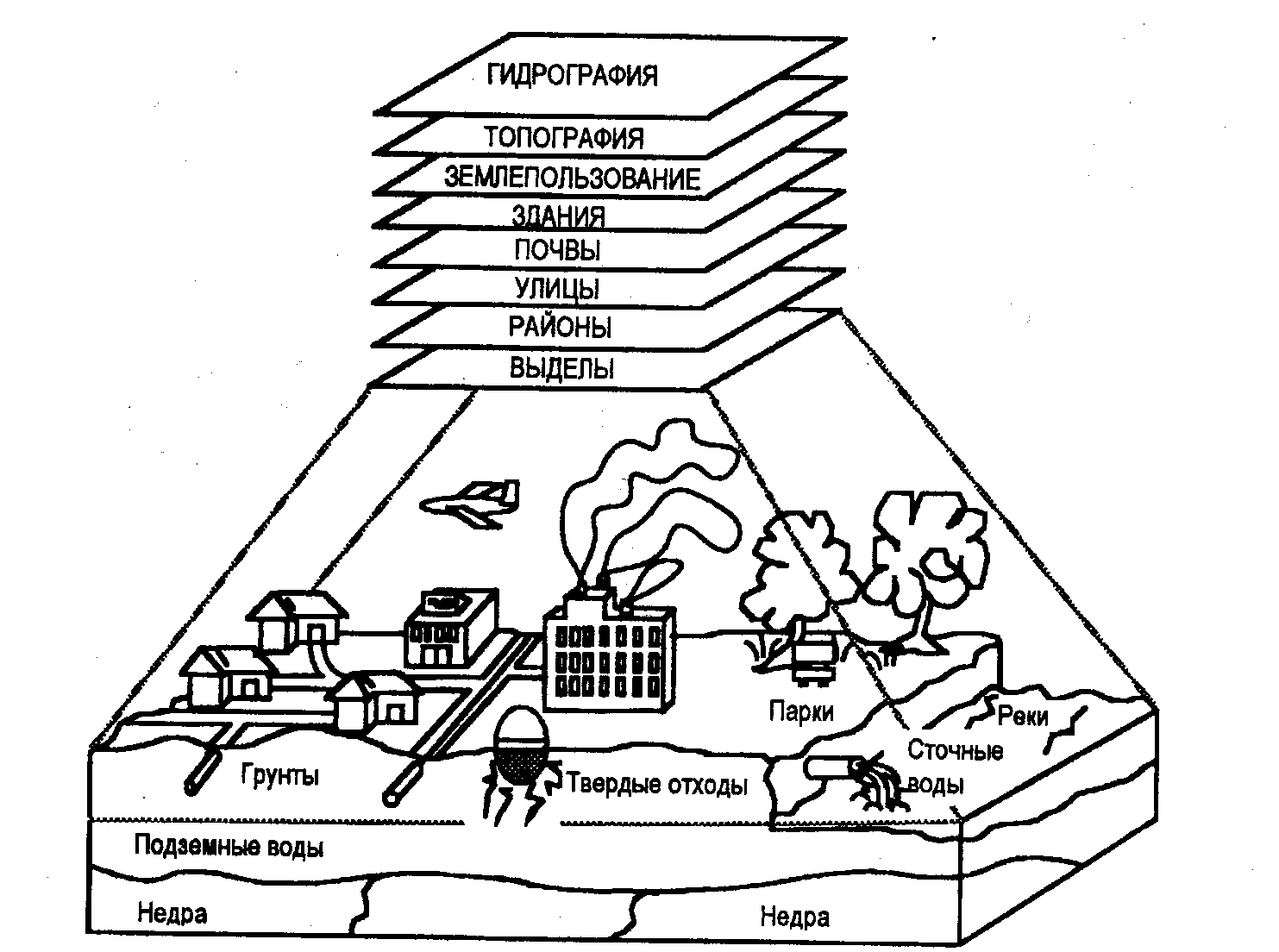Рис. 2. Демонстрация принципа систематизации информации в ГИС (в виде тематических слоев) В ГИС использован наиболее легкий для человеческого восприятия способ систематизации и упорядочения информации - графическое отображение объекта и "привязка" к нему всевозможных данных. Электронная карта воспроизводит понятные и привычные образы - элементы природной среды, селитебные и промышленные зоны, места отбора проб, дорожную или железнодорожную сеть и т.п. При этом каждый графический образ связан с таблицей атрибутов, где размещены фактические данные, характеризующие отображаемый объект. Так, заводу будут соответствовать табличные сведения о выпускаемой продукции, технологиях, используемых в производстве, гигиенической характеристики рабочих мест, объемах выбросов в атмосферу, воду, образовании отходов и т.п. Точки отбора проб сопряжены с таблицами, в которые вносятся данные о результатах натурных замеров. При этом важно отметить, что все собранные и упорядоченные в ГИС сведения в дальнейшем могут воспроизводиться как в исходном виде, так и в качестве различных статистических показателей, например ввиде средних значений, доверительных границ показателя и т.п. Систематизация данных в ГИС обеспечивает информационную преемственность как по горизонтали (т.е. в разрезе различных информационных источников, функционирующих на одной территории), так и по вертикали (т.е. для одной информационной системы, но для ее различных уровней управления, например в системе социально-гигиенического мониторинга районного-областного-федерального уровней). II.Социально-гигиенический мониторинг. 1.Организация социально-гигиенического мониторинга Социально-гигиенический мониторинг проводится на федеральном уровне, уровне субъектов Российской Федерации, в городских и сельских поселениях органами и учреждениями государственной санитарно-эпидемиологической службы Российской Федерации совместно с федеральными органами исполнительной власти субъектов Российской Федерации, органами местного самоуправления. Порядок проведения социально-гигиенического мониторинга устанавливается Правительством Российской Федерации. Социально-гигиенический мониторинг – государственная система наблюдения, анализа, оценки и прогноза состояния здоровья населения и среды обитания человека, а также определения причинно-следственных связей между состоянием здоровья населения и воздействием факторов среды обитания человека. Федеральный информационный фонд данных социально-гигиенического мониторинга представляет собой базу данных о состоянии здоровья населения и среды обитания человека, сформированную на основе многолетних наблюдений, а также совокупность нормативных правовых актов и справочных материалов в области анализа, прогноза и определения причинно-следственных связей между состоянием здоровья населения и воздействием факторов среды обитания человека. В рамках мониторинга используются данные наблюдения: