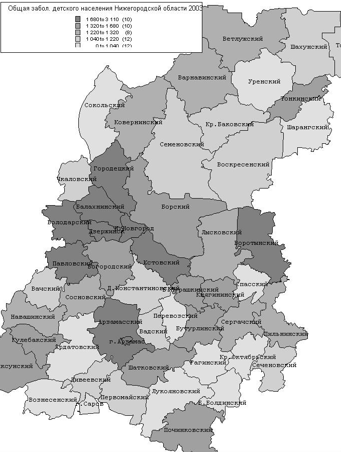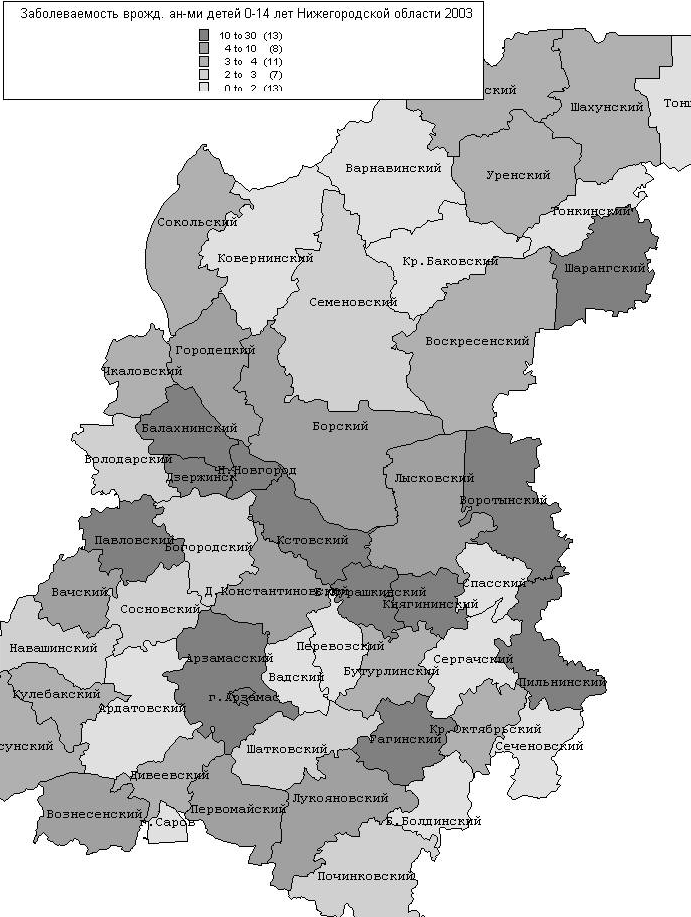 В 2003 г. наиболее часто регистрируемой патологией по-прежнему остаются болезни органов дыхания, их доля в структуре заболеваемости составляет 63,6%. Высокие уровни заболеваемости органов дыхания, превышающие среднеобластные цифры, отмечены в Павловском, Балахнинском, Кстовском, Володарском, Городецком, Воротынском, Кулебакском районах и городах Н.Новгороде, Дзержинске. Р С 1997 г. по 2003 г. прослеживается значительная тенденция роста болезней эндокринной системы на 47,6%, болезней крови – на 47,5%, нервных болезней – на 57%, болезней системы кровообращения – на 79,3%, органов пищеварения – на 82%, мочеполовой системы – на 32,9%, болезней костно-мышечной системы – на 109%, врожденных аномалий – на 143,8%, отдельных состояний, возникающих в перинатальном периоде – на 102%. Из класса болезней крови следует выделить анемии, которые составляют 93% всех заболеваний крови. По данной патологии Нижегородская область не превышает среднероссийские показатели, но, тем не менее, в 2003 г. у детей заболеваемость анемиями в 1,5 раза больше чем в 1997 г. Особенно высокие показатели отмечены в Тоншаевском, Пильнинском, Борском, Б.Мурашкинском районах, где превышения составляют 3 и более раза по сравнению со среднеобластными цифрами. Из года в год в области среди детей регистрируются высокие уровни врожденных пороков (аномалий развития), и за последние 9 лет данный показатель вырос в 2,7 раза от 3,56 в 1994 году до 9,51 в 2003 г. (Диаграмма 8; рис. 3). Наибольший уровень врожденных аномалий в 2003 г. наблюдается в Большемурашкинском, Павловском, Воротынском, Гагинском, Кстовском, Княгининском, Арзамасском, Пильнинском, Балахнинском районах, городах Н.Новгороде, Дзержинске.