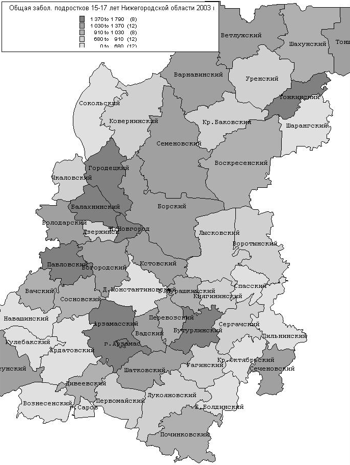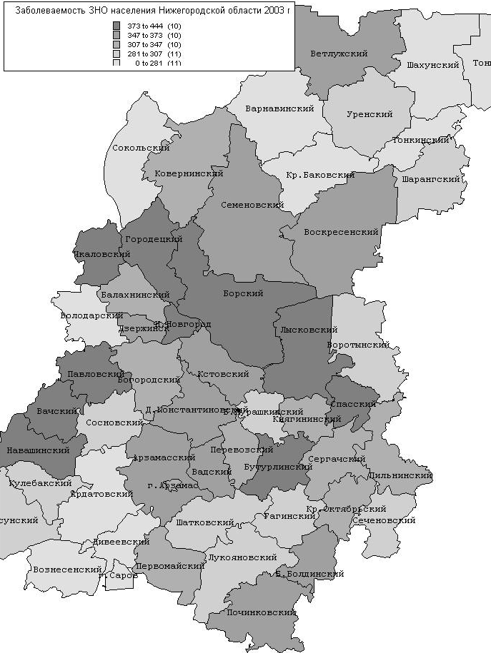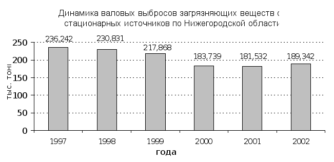 5.Заболеваемость населения. С ходом исторического развития приоритетное значение приобретают разные факторы: природные условия и состояние среды обитания, социально-экономическая ситуация, уровень медицинского обслуживания, биологические характеристики организма. Резкое ухудшение здоровья населения Нижегородской области, как и России в целом, в период системного кризиса 90-х свидетельствует о немало важной роли социально–экономических преобразований в формировании здоровья на данном этапе. Реакцию населения можно оценить как социальный стресс, наиболее остро проявившийся в 1992-1994 годы. Произошло снижение ожидаемой продолжительности жизни, обусловленное быстрым ростом смертности от сердечно-сосудистых заболеваний, травм и отравлений, в т .ч. убийств, самоубийств и отравлений алкоголем. Увеличился уровень заболеваемости социально-значимыми болезнями: психическими расстройствами и болезнями нервной системы, венерическими болезнями, туберкулезом. Так у детей и подростков Нижегородской области первичная заболеваемость психическими расстройствами увеличилась за последние 5 лет на 30 и 40 %, болезнями нервной системы – на 57 и 77%, соответственно. В связи с этим, исследование воздействия изменений в социально-экономической сфере на здоровье населения является актуальной проблемой. Для состояния здоровья большое значение имеют условия проживания. В целом по Нижегородской области происходит улучшение ситуации с благоустройством жилищного фонда. Общая площадь жилья, оборудованного водопроводом, канализацией, централизованным отоплением, ваннами, горячим водоснабжением, продолжает увеличивается. Данные тенденции просматриваются как в сельской, так и городской местности. Зависимость заболеваемости от состояния среды обитания.Нижегородская область является одной из наиболее развитых в Приволжском федеральном округе промышленных зон с напряженной экологической обстановкой. Определение взаимосвязи между состоянием среды обитания и здоровьем человека дает перспективу осуществления мероприятий по предупреждению отрицательных влияний. Одной из главных задач на современном этапе решения экологических проблем является углубленное изучение взаимоотношений человека и факторов окружающей среды с разработкой мероприятий по охране и оздоровлению окружающей среды. Атмосферный воздух - важный фактор среды обитания человека, влияющий на возникновение и развитие экологически обусловленных заболеваний населения, подлежащий оценке в системе социально - гигиенического мониторинга. Источниками антропогенного загрязнения атмосферы являются как промышленные предприятия, так и автотранспортные средства. По данным Нижегородского областного комитета статистики на 01.01.2003 года на 670 предприятиях Нижегородской области функционировало 31864 стационарных источника выбросов загрязняющих веществ в атмосферу, из них 8,8 процента неорганизованных. При сокращении числа источников по сравнению с предыдущими годами, более чем на одной трети предприятий области отмечается рост объемов выбросов, увеличивающий степень негативного влияния на качество и безопасность воздушной среды. Ситуация усугубляется прогрессирующим износом и моральным старением производственного оборудования, снижающим возможность использования передо