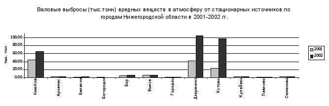 - в кластер I, c выбросами загрязняющих веществ до 1 тыс. тонн, вошли 32 района области; - в кластер II (1,1 –5 тыс. тонн) - 11 районов; - в кластер III (5,1 –10 тыс. тонн) - 3 района, - в кластер IV (10,1 тыс. тонн и более) - 4 района. Самым низким уровнем выбросов на своей территории (всего 4 тонны за год) характеризуется Краснооктябрьский район, затем Большеболдинский и Гагинский районы, где объем выбросов определялся до 37 тонн. В семи районах области: Большемурашкинском, Бутурлинском, Воротынском, Вознесенском, Княгининском, Сокольском выбросы не превышают 150 тонн. Наибольший техногенный прессинг от одних из крупнейших не только в регионе, но и в стране, промышленных комплексов испытывают города области: Н.Новгород, Дзержинск, Кстово, Выкса. Далее в порядке убывания: Бор, Арзамас, Балахна, Кулебаки, Павлово, Городец, Богородск (диаграмма ). Диаграмма