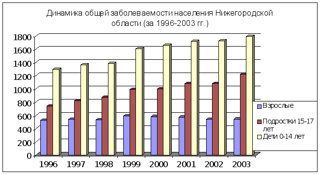 У подростков, как и у детей, сохраняется стойкая тенденция роста уровня первичной заболеваемости. В 2003 г. общая заболеваемость составила 1217,18 на 1000 подростков, что в 1,4 раза больше чем в 1998 г. (см. табл.). Таблица Первичная заболеваемость подростков 15-17 лет Нижегородской области за 1998-2003 гг.