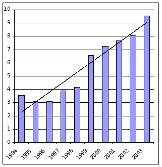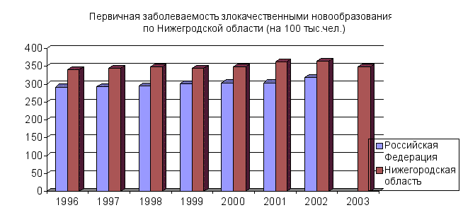 Наиболее часто регистрируемая патология у взрослых связана с болезнями органов дыхания – 19,6%. По данному показателю Нижегородская область незначительно превысила средний уровень по Российской Федерации (РФ 2002 г. - 210,89). По данному классу основную долю составляют заболевания с хроническими формами (бронхит хронический, неуточненный, эмфизема, хронический фарингит), обращает на себя внимание стойкая тенденция роста заболеваемости астмой, астматическим статусом, за последние 6 лет она возросла на 21%. На втором месте после органов дыхания по распространенности стоят болезни системы кровообращения - 16,8%. Здесь следует обратить внимание на болезни, характеризующиеся повышенным кровяным давлением, заболеваемость которыми за анализируемый период выросла на 84,6%. Нижегородская область на протяжении многих лет характеризуется стабильно высоким уровнем и темпами роста заболеваемости злокачественными новообразованиями по сравнению с Российской Федерацией. По Приволжскому ФО при ранжировании Нижегородская область по онкозаболеваемости занимает 2 место, уступая лишь Самарской области. Анализируя динамику онкозаболеваемости с 1994 года по 2002 год, отмечался рост уровня заболеваемости, в 2003 г. уровень злокачественных новообразований несколько снизился и составил 349,1 на 100 тыс. населения, но он по прежнему превышает среднероссийский показатель (диаграмма). (Диаграмма ).