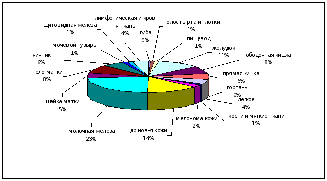 Высокие уровни онкологической заболеваемости, превышающие средние значения по области, отмечены как в крупных промышленных центрах, так и в районах с преимущественным развитием сельского хозяйства: Городецкий (444,0), Бутурлинский (442,2), Вачский (420,4), Лысковский (409,8), Борский (405,6), Спасский (399,8), Павловский (378,8), Навашинский (375,8), Чкаловский (373,4), Семеновский (372,8), Б.Болдинский (371,5), Починковский (367,6), Ветлужский (367), Вадский (365), Кстовский (353,9), Арзамасский (351,7), Воскресенский (349,2), г.Н.Новгород (385,1), г.Дзержинск (371,4)(см.рис. 6). Структура заболеваемости среди мужчин и женщин неодинакова. Ведущей патологией у женщин являются злокачественные опухоли молочной железы (23,2%), на втором месте - ЗНО кожи (14,3%), на третьем - ЗНО желудка (11,5%), четвертом - ЗНО тела матки 8,4%, пятом - ЗНО ободочной кишки (7,5%) (см. диаграмму ). Диаграмма Структура заболеваемости ЗНО женщин Нижегородской области в 2003 г.