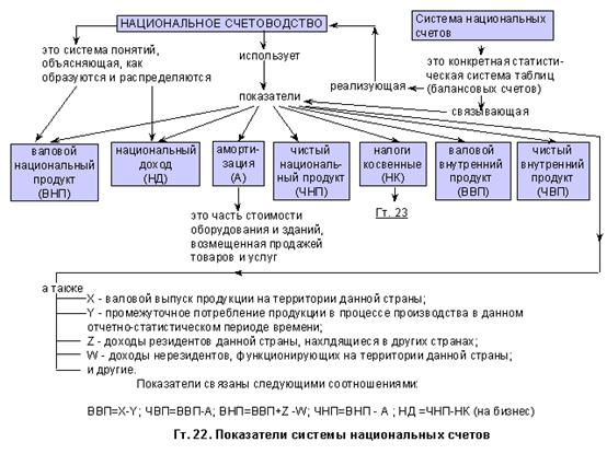 Обозначение методов разработки: 1. статистические методы обработки временных рядов 2. эконометрические методы 3. циклические сравнения 4. внешние источники информации. 2.8 Роль макроэкономических показателей. На основе ВВП рассчитываются показатели национальных счетов, широко используемые в экономической теории и статистике. Система национальных сетов связывает воедино важнейшие экономические показатели – объем выпуска товаров и услуг, совокупные доходы и расходы общества. СНС представляет собой современную систему сбора и обработки информации и применяется практически во всех странах для макроэкономического анализа рыночной экономики. Она позволяет в наглядной форме представить ВВП (ВНП) на всех стадиях его движения, т.е. производства, распределения, перераспределения и конечного использования. Ее показатели отражают структуру рыночной экономики, институты и механизмы функционирования. Использование СНС необходимо для проведения эффективной макроэкономической политики государства, экономического прогнозирования, для международных сопоставлений национального дохода. Ниже приведена краткая схема Системы национальных счетов.