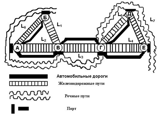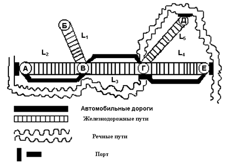 Для корректного расчета сравнительной стоимости грузоперевозок различными видами транспорта необходимо, чтобы в каждом пункте транспортной сети существовали все варианты видов собщения, то есть и автомобильные дороги, и речные пути и железные дороги. Руководствуясь данными таблиц, получим, что самый короткий путь сообщения - железнодорожный - и хотя его строительство и является самым дорогим, но пропускная способность, и, соответственно, расходы на перевозку 1 тонны груза значительно меньше, чем для автомобильной дороги. Для того, чтобы частично разгрузить пункт Б и снизить задержки грузов в самом грузонагруженном пункте А , нужно постороить речной путь между пунктом А и пунктом Б а также автомобильную дорогу т.к. пункты А и Б самые грузонагруженные. Также необходимо построить речной путь между пунктами А и В , для того, чтобы ускорить траффик грузов до пунктов В, Г, Д, Е. В пункте Д присутствуют только железнодорожные пути и речной порт, поэтому необходима постройка автомобильной дороги.