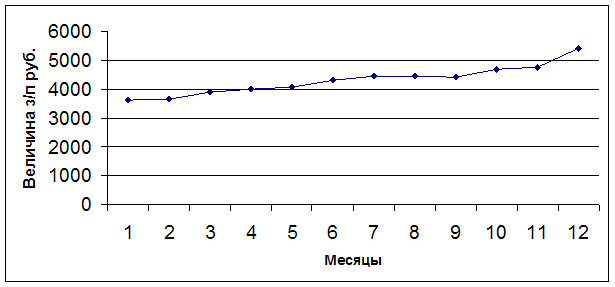 Примерные значения заработной платы составят в: январе 2004 – 5747 рублей 9 копеек феврале 2004 – 5909 рублей 64 копейки марте 2004 – 6072 рубля 18 копеек Вывод: При анализе результатов прогнозирования обоими методами можно с уверенностью сделать вывод о росте значения средней начисленной заработной платы в первые 3 месяца 2004 года. Выводы и предложения На основании расчётов произведённых разделах 3 и 4 можно сделать ряд выводов: 1. Размер средний начисленной заработной платы и средний размер накопления сбережений во вкладах и ценных бумагах находятся в прямой зависимости, так как при увеличении средних значений одного признака увеличиваются и средние значения другого. 2. Скорость роста (цепной абсолютный прирост) средней начисленной заработной платы равна примерно 162 рубля 55 копеек в месяц. Среднемесячный темп роста составляет примерно 103,7%. 3. Аналитическое выравнивание ряда динамики выполнено, верно, потому что разность между исходными и выровненным уровнем составляет всего 0,0004, и объясняется округлением данных. 4. Значение средней начисленной заработной платы отклоняется от своего среднего значения примерно на 145 рублей или на 3,36%. 5. Совокупность однородна по своему составу, об этом свидетельствует коэффициент вариации, он менее 33%. 6. Так как коэффициент корреляции больше ноля, то есть положительная величина то можно утверждать, что показатели находятся друг с другом в прямой зависимости. Полученная величина коэффициента корреляции равного 0,7494 свидетельствует о возможном наличии достаточнотесной прямой зависимости между рассматриваемыми признаками. Для рассматриваемого примера величина коэффициента детерминации будет равна 0,5616, а это значит, что 56,16% вариации объёма средних накоплений сбережений во вкладах и ценных бумагах, объясняется вариацией средней начисленной заработной платы. Коэффициент корреляции не зависит от случайных обстоятельств. 7. По прогнозам размер заработной латы будет возрастать, он имеет стойкую тенденцию к увеличению. С ростом заработной платы будет происходить и рост объёма сбережений во вкладах и ценных бумагах. При расчётах методом среднегодовых показателей данные получаются несколько выше чем при расчётах методом экстраполяции. В целом по всей работе прослеживается тенденция по увеличению объёмов заработной платы. Но надо принять во внимание один факт. Расчёты в курсовой работе производились по месяцам 2003 года. Этот год был довольно стабильным в финансовом отношении. По этому наблюдался столь большой рост зарплаты. Но Российская экономика характеризуется своей непредсказуемостью. В следствие этого возможно очень существенное отклонение прогнозируемых данных от фактических. Российская экономика вообще трудно поддаётся какому – либо прогнозированию. В качестве предложений можно сделать следующие меры: 1. Повысить размер социальных трансфертов населению (пенсий, пособий, стипендий) для увеличения доходов. 2. Сделать минимальный размер заработной платы равным прожиточному минимуму. 3. Усовершенствовать методику расчёта прожиточного минимума, в соответствии с реальной экономической ситуацией в стране. 4. Повысить среднюю заработную плату работникам бюджетной сферы до среднеобластного уровня. 5. Ввести контроль и государственное регулирование цен на жизненно важные товары и услуги. В рез