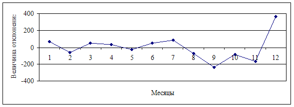 Для наибольшей наглядности полученных данных Отклонение фактических уровней от теоретических представим в виде графика. Рис 2. Отклонение фактических уровней от теоретических По графику видно, что наибольшее отрицательное отклонение в сентябре, а наибольшее положительное декабре. Проверим правильность