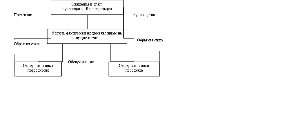 Ожидания и опыт руководителей и владельцев Услуги, фактически предоставленные на предприятии Ожидания и опыт потребителя Ожидания и опыт персонала Претензии Руководство Обратная связь Обратная связь Обслуживание Во-первых, владельцы и руководство гостиницы доподлинно знают об ожиданиях каждого конкретного гостя, и они довели это знание до персонала гостиницы в виде определенных для каждого работника обязательных правил обслуживания. Во-вторых, весь персонал гостиницы хочет и может работать по установленным для них правилам: бармен — по своим, горничная — по своим, портье — по своим и так далее. К сожалению, часто случается так, что персонал не соблюдает в работе требований, установленных руководителями, точно так же, как установленные требования не в полной мере отражают требования гостей к качеству услуги. Это «столкновение ожиданий» показано на рис 1.1 При восприятии и оценке качества получаемого обслуживания гость исходит из своих ожиданий. Обслуживающий персонал, предоставляя обслуживание, исходит из требований руководства и своих ожиданий, которые им (персоналом) рассматриваются как наиболее вероятная версия ожиданий гостя. Владельцы и руководство гостиницы имеют свою версию ожиданий гостя и, руководствуясь
