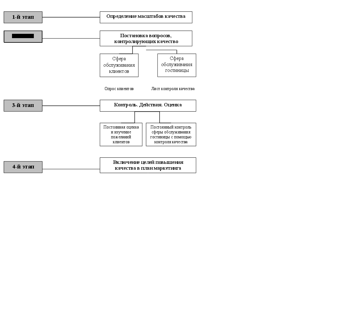 Реализация целей, поставленных выше, предполагает определенные временные рамки. Таким образом, процесс контроля качества услуг распадается на несколько этапов. 1-й этап: Определение масштабов измерения качества. Для того чтобы сделать первый шаг – определить масштабы качества – необходимо применить все формы стандартизации, относимые к качеству. Четко определенные масштабы качества, которые связаны с объемом работ, условиями работы, уровнем подготовки персонала, должны быть реалистичными и достижимыми, чтобы стать основой всех последующих усовершенствований. 2-й этап: Постановка вопросов, проверяющих уровень качества. Здесь должны различаться сфера, контактирующая с клиентами и службы заднего плана, или сфера управления и обслуживания гостиничного предприятия. Мнение клиентов о качестве обслуживания должно изучаться на основе внутригостиничных листов-опросников. Сфера обслуживания гостиничного предприятия, включающая склады и хранилища, технические службы и т.д., контролируется на предмет качества с помощью специальных листов качества (внутрипроизводственных стандартов). 3-й этап: Контроль. Действия. Оценка. Опросники и листы проверки качества должны составлять основу для разработки программ профессиональной подготовки персонала отделов обслуживания. Работа персонала гостиницы должна быть сфокусирована на повышение качества, качество должно рассматриваться с точки зрения гостя. С другой стороны, программа проверки качества способствует лучшему взаимодействию подразделений гостиницы между собой. В любом случае, высшему менеджменту предприятия следует рекомендовать рассматривать возникшую проблему качества с позиции «почему это случилось», а не с позиции «кто виноват». 4-й этап: Постановка целей качества в маркетинговом плане. В годовом маркетинговом плане, помимо анализа рыночной конъюнктуры следует также отражать анализ собственного производства, в первую очередь – состояние качества обслуживания на данном предприятии. В рамках планирования деятельности предприятия должны быть определены стандарты качества работы отеля, которые устанавливаются в маркетинговом плане как конечная цель и контролируется наиболее строгим критиком – клиентом. Приведенные рекомендации позволят ОАО «Калининград» обеспечить своевременный анализ качества и уровня потребительской удовлетворенности, разработать и внедрить стандарты качества на предлагаемые услуги, а значит, обеспечат более качественное обслуживание потребителей по сравнению с конкурентами. Данные мероприятия, при условии их соответствующего исполнения, обеспечат гостинице конкурентное преимущество, что, в свою очередь отразится на результатах финансово-хозяйственной деятельности и увеличению показателей доходности на вложенный капитал. ЗАКЛЮЧЕНИЕ