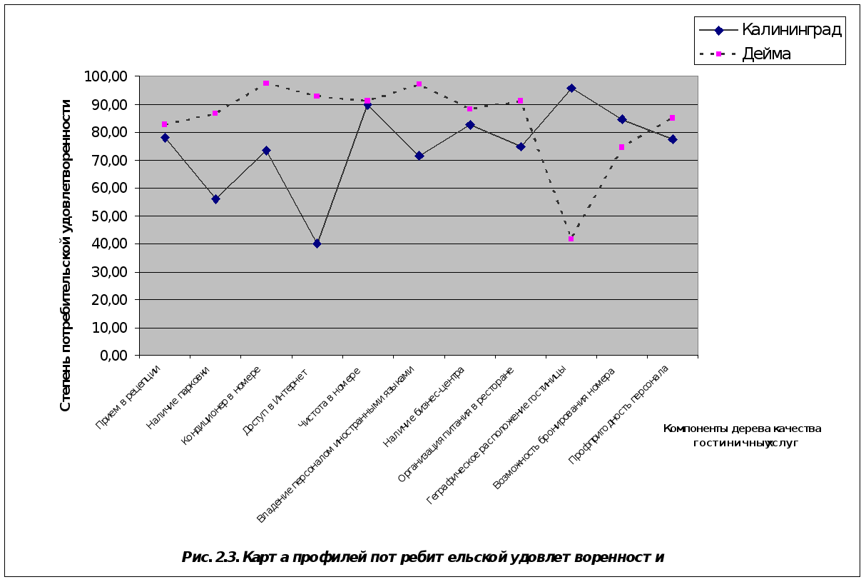 «Калининград» не имеет, но в настоящее время ЗАО «Рэй», арендующее у ОАО офисные площади, может предложить гостям доступ в Интернет через телефонную линию, со своим ноутбуком, что в ряде случаев не всегда удобно. Обратим внимание и на важность географического положения гостиницы. При проведении опроса абсолютное большинство потребителей поставило оценку 5 в графе важности компонента дерева. Можно с уверенностью заявить о том, что исключительно выгодное географическое положение гостиницы и должно стать тем локомотивом обеспечения стабильного преимущества перед более удаленными от центра конкурентами. Индексация степени удовлетворенности потребителя позволяет формализовать организационную работу фирмы на основании нужд и ожиданий потребителя. Для сравнения степени удовлетворенности потребителем качества предоставляемых гостиничных услуг было проведено исследование потребительской удовлетворенности в гостинице «Дейма». Гостиничный комплекс «Дейма» является одним из самых серьезных конкурентов гостиницы «Калининград» по ценовому сегменту рынка. Всего было опрошено 56 человек. Так как количество опрошенных примерно в два раза меньше опрошенных при выяснении индекса потребительской удовлетворенности по гостинице «Калининград», то результаты следует увеличить в два раза. Для удобства сравнения степени потребительской удовлетворенности гостиничных услуг, предоставляемых вышеупомянутыми гостиницами построим карту профилей потребительской удовлетворенности. С помощью карты профилей можно сравнить профили удовлетворенности потребителей продуктом фирмы с профилем удовлетворенности подобным продуктом, поставляемым на рынок ее конкурентом. Это сравнение показывает достоинства и недостатки выпускаемого продукта после соответствующей оценки различных компонентов дерева удовлетворенности (анализ конкурентоспособности продукта) и позволяет наметить пути улучшения его качества с целью удержания существующего потребителя компании и привлечения на свою сторону потребителя конкурента.