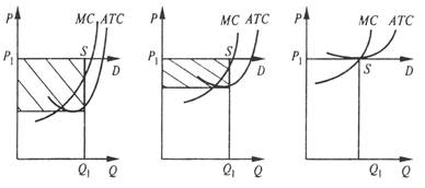 Для наглядности представим этот процесс графически. Предположим, на данном туристском рынке в условиях совершенной конкуренции действуют три фирмы: фирма А располагает лучшим туристским ресурсом (ее гостиница находится в самом центре города); фирма Б располагает средним туристским ресурсом (ее гостиница находится на некотором расстоянии от центра города); фирма В располагает худшим туристским ресурсом (ее гостиница находится за городом, что требует значительных затрат на доставку туристов). Предположим, что все прочие условия у этих фирм одинаковы и равны. В таком случае кривые средних валовых (АТС) и предельных издержек (МС) будут иметь вид, показанный на рис.3.3.