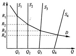 На рисунке буквенные символы означают: Q - количество туристских ресурсов на рынке туристских услуг; Q1 - количество уникальных туристских ресурсов, предложение которых абсолютно неэластично и единично; Q2 - количество лучших туристских ресурсов, предложение которых неэластично, но не единично; Qз - количество средних туристских ресурсов, предложение которых характеризуется низкой эластичностью и на которые могут появиться заменители; Q4 - количество относительно худших туристских ресурсов, предложение которых характеризуется низкой эластичностью и на которые имеются заменители; S1, S2, Sз и S4 - кривые предложений на рынке туристских услуг соответственно уникальных, лучших, средних и худших туристских ресурсов; D - кривая спроса на туристские ресурсы как следствие спроса на туристские услуги; R -величина той или иной формы туристской ренты; R1 - величина монопольной туристской ренты в условиях рыночного равновесия; R2 - величина дифференциальной туристской ренты, образующейся при использовании лучших по качеству туристских ресурсов в условиях рыночного равновесия; Rз - величина дифференциальной туристской ренты, образующейся при использовании средних по качеству туристских ресурсов в условиях рыночного равновесия; R4 - величина абсолютной туристской ренты в условиях рыночного равновесия.