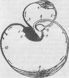 Рисунок 2.2 - Схема кровообращения человека 1 - правое предсердие; 2 - правый желудочек; 3 - легочная артерия; 4 - капилляры в легких; 5 - легочная вена; 6 - левое предсердие; 7 - левый желудочек; 8 - аорта; 9 - капилляры тела; 10 - полая вена. Центром кровеносной системы является сердце, выполняющее роль двух насосов. Правая сторона сердца (венозная) продвигает кровь по малому кругу кровообращения, левая (артериальная)- по большому кругу Малый круг кровообращения начинается от правого желудочка сердца, затем венозная кровь поступает в легочный ствол, который разделяется на две легочные артерии, которые делятся на более мелкие артерии, переходящие в капилляры альвеол, в которых происходит газообмен (кровь отдает углекислый газ и обогащается кислородом). Из каждого легкого выходит по две вены, впадающие в левое предсердие. Большой круг кровообращения начинается от левого желудочка сердца. Обогащенная кислородом и питательными веществами артериальная кровь поступает ко всем органам и тканям, где происходит газообмен и обмен веществ. Забрав из тканей углекислый газ и продукты распада, венозная кровь, собирается в 29 вены и двигается к правому предсердию. По кровеносной системе перемещаегся кровь, которая бывает артериальной (насыщенной кислородом) и венозной (насыщенной углекислым газом). У человека существуют три типа кровеносных сосудов: артерии, вены, капилляры. Артерии и вены отличаются друг от друга направлением движения крови в них. Таким образом, артерия - это любой сосуд, несущий кровь от сердца к органу, а вена - несущий кровь от органа к сердцу, независимо от состава крови (артериальная или венозная) в них. Капилляры - тончайшие сосуды, они тоньше человеческого волоса в 15 раз. Стенки капилляров полупроницаемые, через них вещества, растворенные в плазме крови, просачиваются в тканевую жидкость, из которой переходят в клетки. Продукты обмена клеток проникают в обратном направлении из тканевой жидкости в кровь. Кровь движется по сосудам от сердца под воздействием давления, создаваемого сердечной мышцей в момент ее сокращения. На возвратное движение крови по венам оказывают влияние несколько факторов: - во-первых, венозная кровь продвигается к сердцу под действием Механизм принудительного продвижения венозной крови к сердцу с преодолением сил гравитации под воздействием ритмических сокращений и расслаблений скелетных мышц называется мышечным насосом. Таким образом, скелетные мышцы при циклических движениях существенно помогают сердцу обеспечивать циркуляцию крови в сосудистой системе; - во-вторых, при