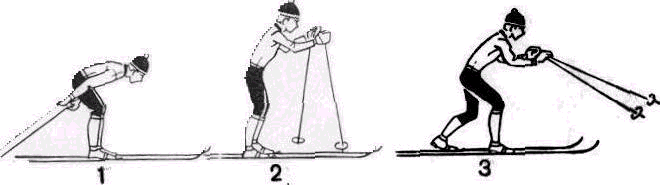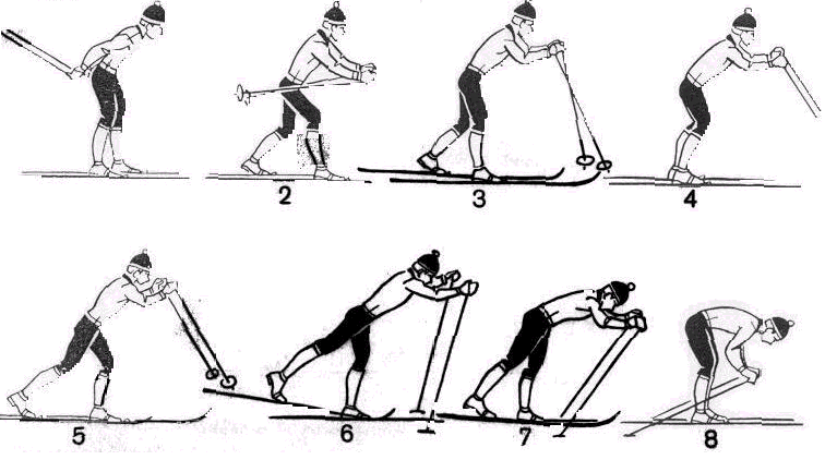А Одновременный двухшажный ход. Лыжник начинает активно и ускоренно подводить маховую ногу к опорной с таким расчетом, чтобы подведение завершилось до окончания отталкивания и руками. Моментом отрыва лыжных палок от снега заканчивается цикл одновременного двухшажного хода. В настоящее время этот ход квалифицированные лыжники применяют редко. Попеременный четырехшажный xoд Цикл движений попеременного четырехшажного хода состоит из четырех скользящих шагов и двух попеременных отталкивании руками на два последних шага. Продолжительность цикла — 1,7—2,2 с, длина—7—10м, средняя скорость в цикле на равнине — 4,0— 6,0 м/с, темп хода — 22—35 циклов в минуту. Рассмотрим действия лыжника в цикле попеременного четырехшажного хода при передвижении на равнине. Одновременно с первым толчком ногой гонщик выносит вперед-вверх одноименную руку с палкой. Толчок ногой (этом ходе делается так же, как и в двухшажном попеременном. К окончанию толчка лыжник должен поднять кисть выносимой вперед полусогнутой руки до уровня плеч. Нижний конец палки при этом обращен назад. С окончанием толчка ногой и выноса одноименной руки гонщик начинает скользить на одной ноге и выносить вперед вторую руку и освободившуюся после толчка ногу. Делается эти с таким расчетом, чтобы к концу второго толчка ногой рука и нога закончили движение одновременно. Во время выноса второй руки и ноги после первого толчка лыжник рукой, начавшей движение раньше, переводит палку в положение кольцом вперед. После окончания второго толчка гонщик готовится к третьему толчку ногой. С началом третьего толчка одноименную толчковой ноге палку следует ставить в положение кольцом от себя. На протяжении третьего толчка ногой она ставится под острым углом. Четвертый толчок ногой лыжник делает аналогично третьему. С началом его лыжник ставит в снег палку для второго толчка рукой. Во время четвертого толчка ногой он делает движение другой рукой, похожее на движение первой руки в момент третьего толчка ногой, а поэтому к окончанию четвертого толчка ногой создаются условия для начала толчка второй рукой. С окончанием толчка второй рукой завершается и цикл движения в четырехшажном ходе. Применяется попеременный четырехшажный ход редко. Коньковые лыжные ходыПолуконьковый ход Полуконьковый ход — один из наиболее эффективных способов передвижения на лыжах. Использование его позволяет развивать высокую скорость. Применяется этот ход на равнинных участках, пологих подъемах н спусках, при движении по дуге. Для него нужна лыжная колея, которая обеспечивала бы правильное направление скольжения лыжника при коньковом отталкивании ногой. Цикл хода состоит из одновременного отталкивания руками, отталкивания ногой скользящим упором и свободного одноопорного скольжения. За цикл лыжник преодолевает 4—9 м за 0,8—1,2 с при средней скорости 4.5—8,5 м/с. Темп хода 50—75 циклов в 1 мин, время отталкивания ногой — 0.25—0,50 с. руками — 0,25—0,44 с. Фазовый анализ движений в цикле хода целесообразно начинать с момента окончания отталкивания ногой. Принцип выделения фаз в цикле хода основывается на временных характеристиках отталкивания ногами, руками и свободного скольжения. Цикл полуконькового хода включает четыре фазы: свободное одноопорное скольжение, скольжение с отталкиванием руками, скольжение на двух лыж