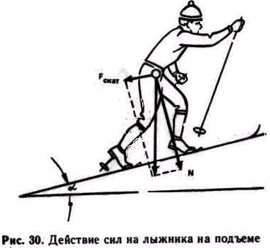 Действие сил на лыжника на подъеме Обычно подъемы составляют до '/з дистанции и преодолеваются скользящим, ступающим, беговым шагом, «полуелочкой», «елочкой», «лесенкой» и коньковыми ходами. Выбор способа преодоления зависит от крутизны подъема, качества смазки лыж, тренированности и технической подготовленности лыжника. Подъемы преодолевают прямо, наискось, зигзагом. При преодолении подъемов действует скатывающая сила, рассчитываемая по формуле Fскат = Psina где Р — масса лыжника, a - крутизна подъема. Лыжник массой 70 кг, идя на подъем крутизной 5°, должен преодолеть силу сопротивления движению (Fскат), равную почти 5 кг, при крутизне подъема 10°—до 12 кг, 15° — до 18 кг. На подъеме сила давления лыжника на опору меньше, чем на равнине, и определяется она по формуле N=Pcosa. Чем круче подъем, тем меньше сила трения. Однако и время скольжения лыж уменьшается и при определенной крутизне лыжник вообще переходит на ступающий шаг. Поэтому с уменьшением силы трения лыж скорость передвижения лыжника на подъеме существенно не увеличивается, а прочность сцепления лыж со снегом уменьшается и лыжнику становится труднее отталкиваться ногами. Поэтому он укорачивает шаг, отталкивается ногой под большим углом и энергичнее работает руками. При одном и том же коэффициенте сцепления (Ксц) лыж со снегом угол окончания отталкивания ногой возрастает на столько, на сколько увеличивается крутизна подъема. Если при коэффициенте сцепления 0,4 на равнине лыжник может закончить отталкивание ногой под углом 68°, то на подъеме крутизной 5° минимальный угол отталкивания ногой будет 73° на подъеме 10° -78°. При переходе с равнины на подъем лыжник до определенного момента продолжает сохранять фазовую структуру скользящего шага. С увеличением крутизны подъема сокращается фаза свободного скольжения. Квалифицированные лыжники способны сохранять свободное скольжение на подъемах крутизной до 5°, а на более крутых подъемах они переходят на скользящий шаг. Отличительная особенность его отсутствие свободного скольжения. В момент окончания отталкивания ногой лыжник ставит одноименную палку на снег. П. ц. м. т. лыжника при этом смешена на пятку опорной ноги. Энергично работая туловищем и рукой, он скользит на лыже, а голень опорной ноги незначительно отклоняет назад. С остановкой лыжи опорную ногу гонщик начинает сгибать в голеностопном и коленных суставах, а маховая нога находится сзади опорной. Лыжа останавливается до выпада. Стояние лыжи до выпада — фаза, которого нет при ходьбе на равнине. Чтобы достичь оптимально высокой скорости при передвижении скользящим шагом, надо не втягивать скольжение лыжи при отталкивании рукой и максимально сокращать фазу стояния лыжи до выпада. Если крутизна подъема более 10°, скользить на лыжах нецелесообразно и лыжники переходят на способ подъема ступающим шагом. При передвижении ступающим шагом лыжник поочередно отталкивается ногами и руками. С окончанием отталкивания одной ногой он сразу же переносит массу тела на другую ногу. Лыжа при этом не скользит. Гонщик ставит палку на опору до окончания отталкивания одноименной ногой и противоположной рукой (фазы свободного скольжения нет). Таким образом, он опирается одновременно на обе палки. Поэтому задача отталкивания руками — перенос массы тела лыжника вперед на опору. При передвижени