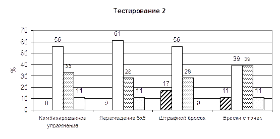 Все результаты тестирования подверглись статистической обработке по критерию t – Стьюдента. Контрольные тесты: «комбинированное упражнение», «штрафной бросок», «броски с точек», «перемещение 6х5» статистически достоверны. (Приложение 4). Ниже на рисунке 3 представлена диаграмма результатов исследования.