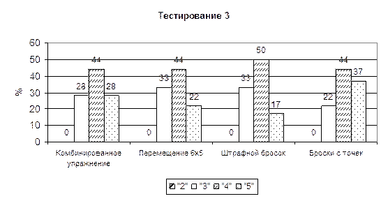 технико-тактической Выводы: Сравнивая результаты исследования по определению уровня подготовленности баскетболисток спортивно-оздоровительной группы с оценочной таблицей мы видим, что большинство баскетболисток в последнем тестировании улучшили свои показатели по сравнению с первым. Так, в начале исследования высокого балла не получила ни одна испытуемая. Оценку «2» в среднем по всем исследованиям получили 30% учащихся, самый низкий процент положительных оценок в контрольном испытании «штрафной бросок»: «2» - 50%; «3» - 50%; «4» и «5» - 0%. Такой низкий процент оценок можно объяснить тем, что данная спортивно-оздоровительная группа была набрана в 2000 году и первые два года тренировалась по плану начальной подготовки. Основное внимание на данном этапе уделялось развитию двигательных способностей, а не технико-тактической подготовке. А на 3-й год обучения тренировки уже проходили по плану УТГ-3, но с меньшим количеством часов (6 часов вместо 10). В октябре 2002г. (второе испытание) – результаты контрольных испытаний улучшились. Оценку «5» - заработали 11% учащихся в таких тестах как «комбинированное упражнение», «перемещение 6х5» и «броски с точек». По сравнению с первым испытанием повысился процент положительных оценок и уменьшился процент отрицательных. Это соотношение можно проследить на гистограммах (рисунок 3). Низкую оценку учащихся получили только в контрольных испытаниях «штрафной бросок» и «бросок с точек». Такое изменение результатов в лучшую сторону можно объяснить тем, что за время летних каникул девочки не переставали заниматься баскетболом, находясь в летнем спортивном лагере, где продолжали совершенствовать свою технико-тактическую подготовку. Из результатов третьего тестирования видно, что значительно уменьшился процент учащихся, получивших оценку «3», возрос процент отметок на оценку хорошо и отлично. Оценку «4» в среднем во всех испытаниях заработали 45,5% занимающихся, а высокую оценку – 25%. В ходе проведения исследования наиболее медленный рост результатов наблюдался в таких контрольных испытаниях, как «штрафной бросок» и «бросок с точек». Объяснить это можно тем, что у девочек были недостаточно развиты необходимые для бросков физические качества и наблюдалась слабая устойчивость техники броска к состоянию утомления. Сравнивая в целом полученные в ходе эксперимента данные и результаты испытуемых, можно сделать вывод, что спортивно-оздоровительная группа под руководством старшего тренера СДЮШОР № 4 технико-тактически подготовлена и некоторые баскетболистки могут быть переведены в учебно-тренировочную группу соответствующего возраста. 3.3. Методические рекомендации по повышению уровня технико-тактической подготовленности баскетболистовТехника в спортивных играх всегда служит осуществлению тактического замысла. Поэтому тактику в баскетболе правильно рассматривают с этой стороны как комплекс путей наиболее рационального использования приобретенной техники для достижения победы в соревнованиях. Для совершенствования спортсменов в правильном подборе и использовании технических приемов, соответствующих определенному тактическому плану, можно рекомендовать следующие практически апробированные методы. Данные методы были апробированы тренером на тренировочных занятиях спортивно-оздоровительно