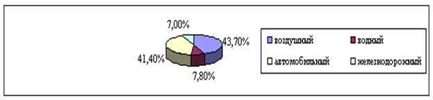 Рис. 1 Структура использования туристами различных видов транспорта Несмотря на то, что международный туризм с каждым годом вовлекает в свою сферу все больше территорий, даже самые удаленные уголки земного шара, существует сильная диспропорция в региональном распределении основных показателей. Важно отметить еще и тот факт, что внутрирегиональный туризм преобладает над межконтинентальным. Европа концентрирует больше половины туристов и поступлений (при этом около 80 % всех туристов живут в пределах этого региона). Правда, постепенно возрастает доля и других регионов.