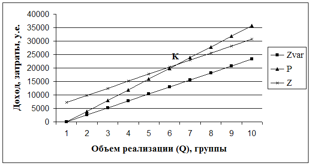 1 у. е. = 28,9 руб. Маржинальный доход представляет собой разность между выручкой от реализации и переменными затратами, или сумму постоянных затрат и прибыли от реализации. Особенностью системы “директ-костинг” является разработка методики экономико-математического и графического представления и анализа отчетов для прогноза прибыли. В прямоугольной системе координат строится график зависимости себестоимости (затрат и дохода) от количества реализованного продукта. По вертикали откладываются данные о себестоимости и доходе, а по горизонтали – количество единиц турпродукта. В точке критического объема производства К нет прибыли, но и нет убытка. Справа от нее находится область чистых прибылей. Для каждого значения количества единиц услуг чистая прибыль определяется как разность между величинами маржинального дохода и постоянных расходов. Слева от критической точки находится область чистых убытков, которая образуется в результате превышения величины постоянных расходов над величиной маржинального дохода.
