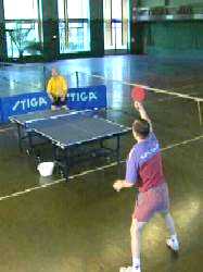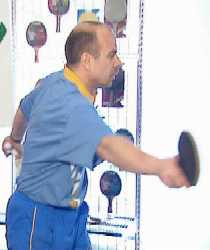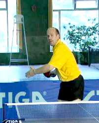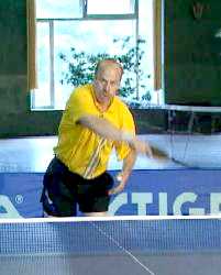 И Анатолий Амелин снова вынужден заходить для удара справа. Он даже поднимается на мысочки - отскок от стола получился высоким. Ну, а мне осталось лишь занять удобное положение и принять мяч опять слева. Не хочет сдаваться Анатолий Амелин, продолжает Сергей. Гоняет меня по всему столу.