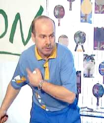 Согласитесь, ситуация для защитника просто тупиковая. Конечно, он будет стараться достать и этот мяч, но, при всех вариантах, он сместиться далеко влево и вам ничего не остается, как нанести завершающий удар в практически пустой стол. Творите, ищите, пробуйте - советует Анатолий Амелин. Современные защитники обладают таким набором технических средств, что бороться с ними простой откидкой занятие бесперспективное. К тому же они всегда могут перейти в атаку, нанося топ-спины из любых положений. Потому, ваша игра, должна вестись осмысленно. Маскируйте свои действия, усыпляйте бдительность серией однотипных движений. Только не перестарайтесь. Ведь защитник все видит, предостерегает Анатолий Амелин. И он может напасть первым. Не допускайте этого. Держите инициативу в руках и ведите игру сами. Вопрос 1.2: Мастер-класс Сергея Тяпкина “защита против атаки” Защитная свеча - этот элемент довольно редко можно увидеть в арсенале профессионалов защиты.
