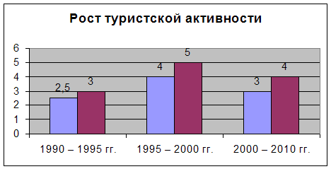 Рис. 2. Рост туристкой активности, % При этом косвенное влияние туризма на экономику почти равно ее прямому результату. Туристический бизнес стимулирует развитие других отраслей хозяйства: строительства, торговли, сельского хозяйства, производства товаров народного потребления, связи и т. д. Данный бизнес привлекает предпринимателей по многим причинам: небольшие стартовые инвестиции, растущий спрос на туристские услуги, высокий уровень рентабельности и минимальный срок окупаемости затрат. В ряде зарубежных стран туризм является одной из самых приоритетных отраслей, вклад в валовой национальный доход которых составляет 15 – 35 % (Венгрия, Чехия, Австрия, Швеция, Италия, Франция, Испания, Португалия [22; 152]). В туристической индустрии динамика роста объемов предоставляемых услуг приводит к увеличению числа рабочих мест намного быстрее, чем в других отраслях временной промежуток между ростом спроса на туристические услуги и появлением новых рабочих мест в туристическом бизнесе минимальный. Россия теряет миллиарды рублей, отказывая туризму в поддержке, кроме того, теряются сотни тысяч потенциальных рабочих мест. Несмотря на продолжающийся туристический бум в России, влияние индустрии туризма на экономику страны пока незначительно. Оно адекватно вкладу государства в развитие данной отрасли и сдерживается, в основном, отсутствием реальных инвестиций, низким уровнем гостиничного сервиса, недостаточным количеством гостиничных мест, дефицитом квалифицированных кадров. По самым оптимистическим подсчетам в российской индустрии туризма занят лишь один работник из 300, что в 30 раз ниже аналогичного мирового показателя. Неразвитость туристической инфраструктуры, невысокое качество сервиса, устойчивый миф о России, как о зоне повышенного риска привели к тому, что в настоящее время на нашу страну приходится менее 1 % мирового туристского потока. В 1994 году дефицит платежного баланса туристской отрасли России составил около 8 млрд. долларов, т.е. прибыль от выездного туризма 4 млрд. долларов не покрыла вывезенных туристами 12 млрд. долларов. В 1995, 1996 годах экономика отечественного туризма постепенно стабилизируется. Меняется и отношение государства к туризму. В 1995 году принят Указ Президента РФ «О реорганизации и развитии туризма в Российской Федерации». Разработана федеральная целевая программа «Развитие туризма в Российской Федерации», а также создана Национальная туристская корпорация. В рамках стран СНГ принят законодательный акт «Об основных принципах сотрудничества государств – участников СНГ в области туризма». [18; 83]. Таким образом, туризм, являясь выгодной отраслью экономики, может стать при соответствующих условиях важнейшей статьей валового национального дохода России.
