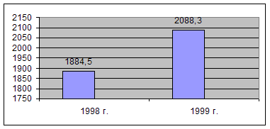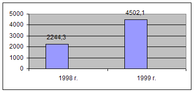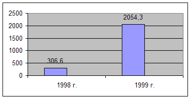 Рис. 14. Количество принятых и отправленных туристов турфирмами области (тыс. чел.) Из рис. 14 видно, что значительно возросло количество принятых туристов на территорию Псковской области, тогда как количество отправленных туристов по сравнению с 1998 годом, в 2001 году уменьшилось. Из рис. 15 можно увидеть, что также увеличилась сумма налогов, поступивших в бюджет Псковской области от деятельности турфирм.
